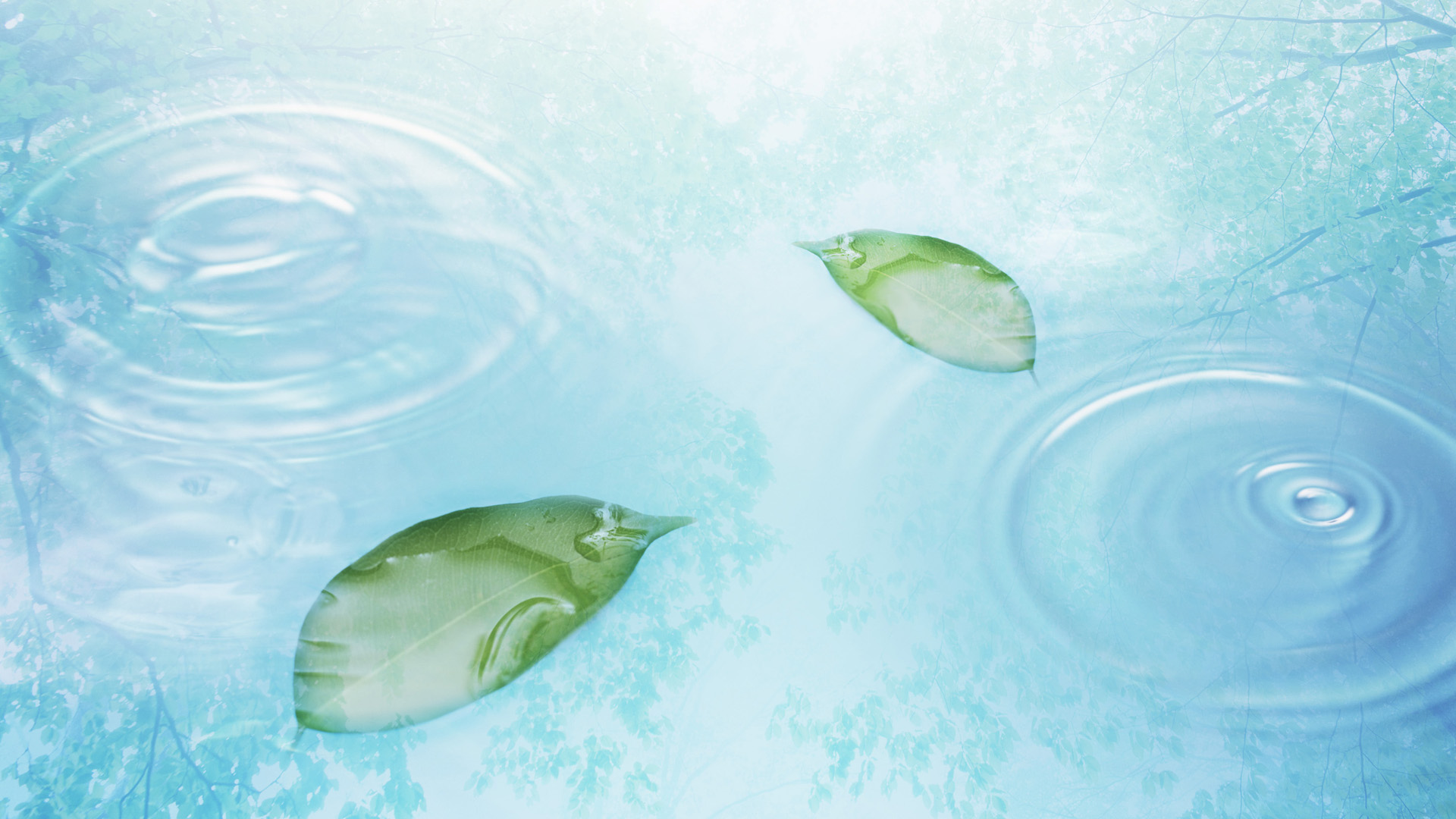 Description: Two fish swim in a pool of water with trees in the background and ripples in the water around them.