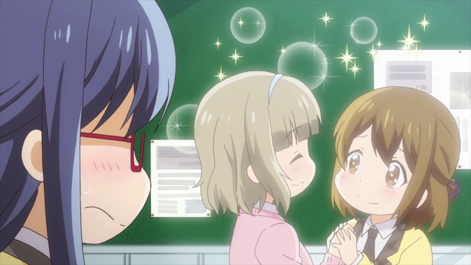 Description: Two girls are standing in front of a blackboard with bubbles on it and one girl is looking at the other.