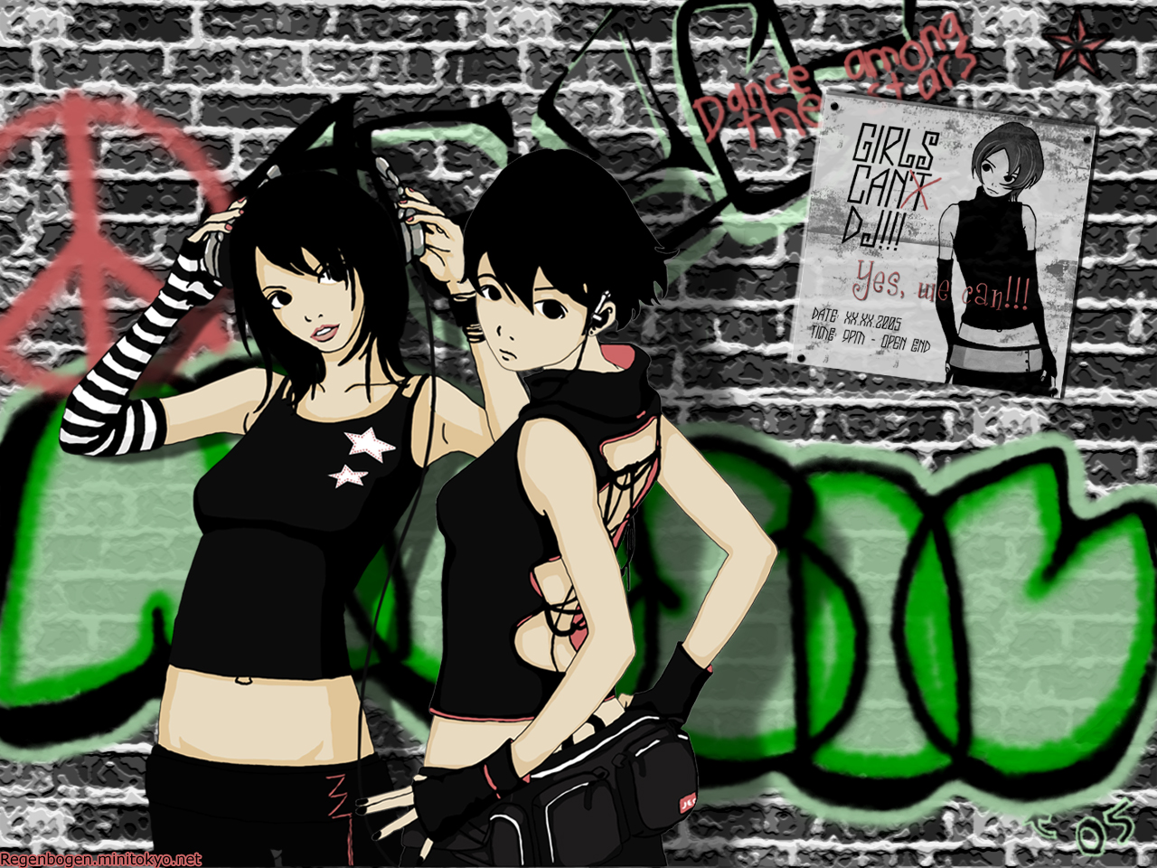 Description: Two girls standing in front of a brick wall with graffiti on it and a peace sign on the wall.