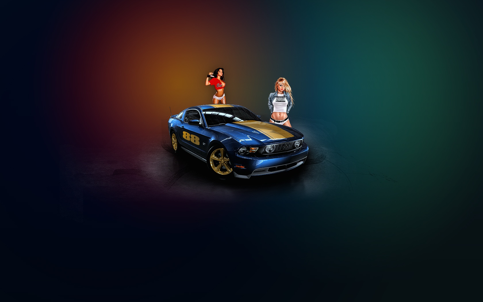 Description: Two girls standing on top of a car in a dark room with a yellow stripe on the hood and a blue car with gold stripes.
