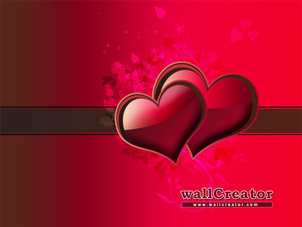 Description: Two hearts on a red background with a brown ribbon and a bow around it with a flower pattern on the bottom.