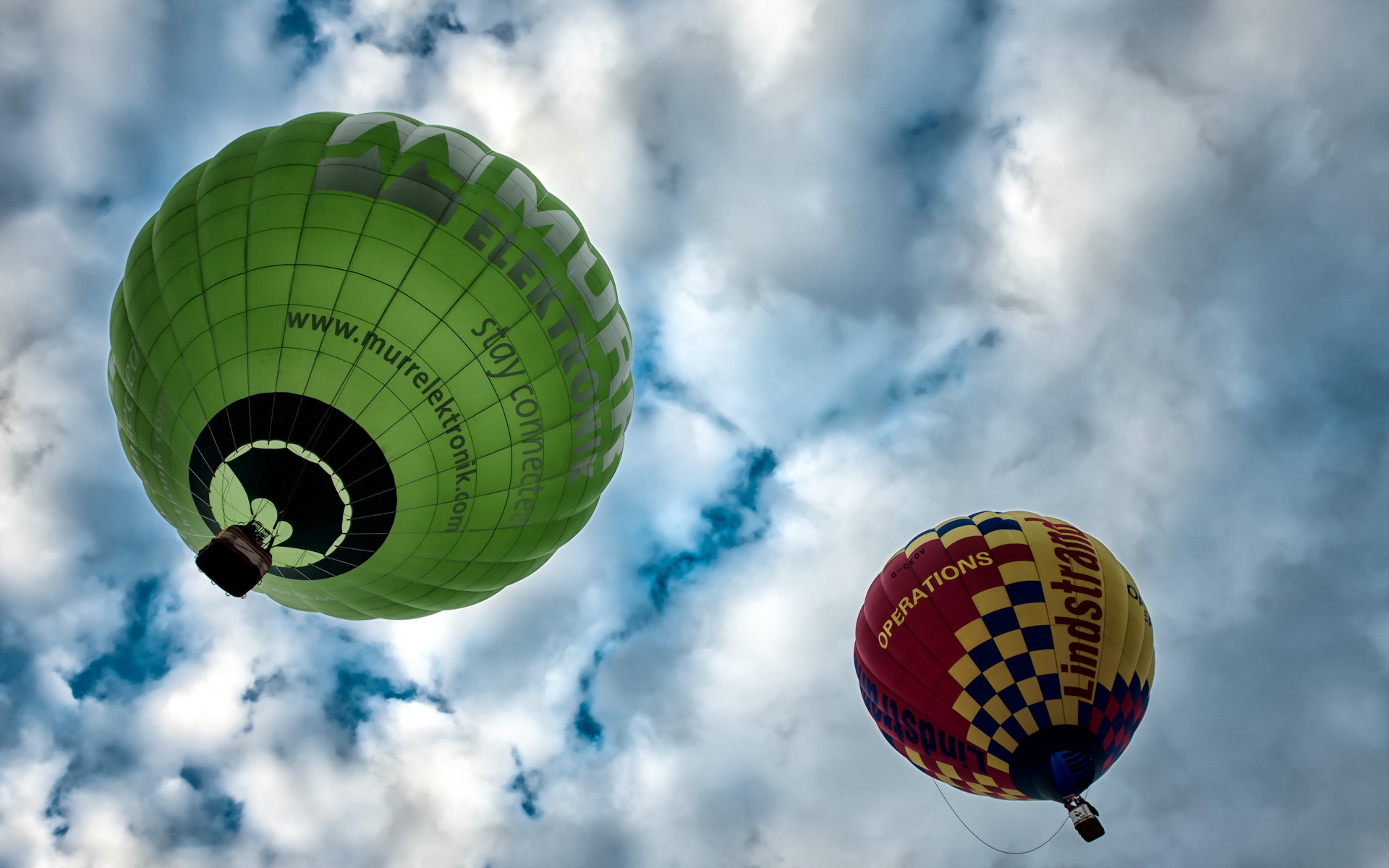 Description: Two hot air balloons flying in the sky with clouds in the background and a blue sky with white clouds.