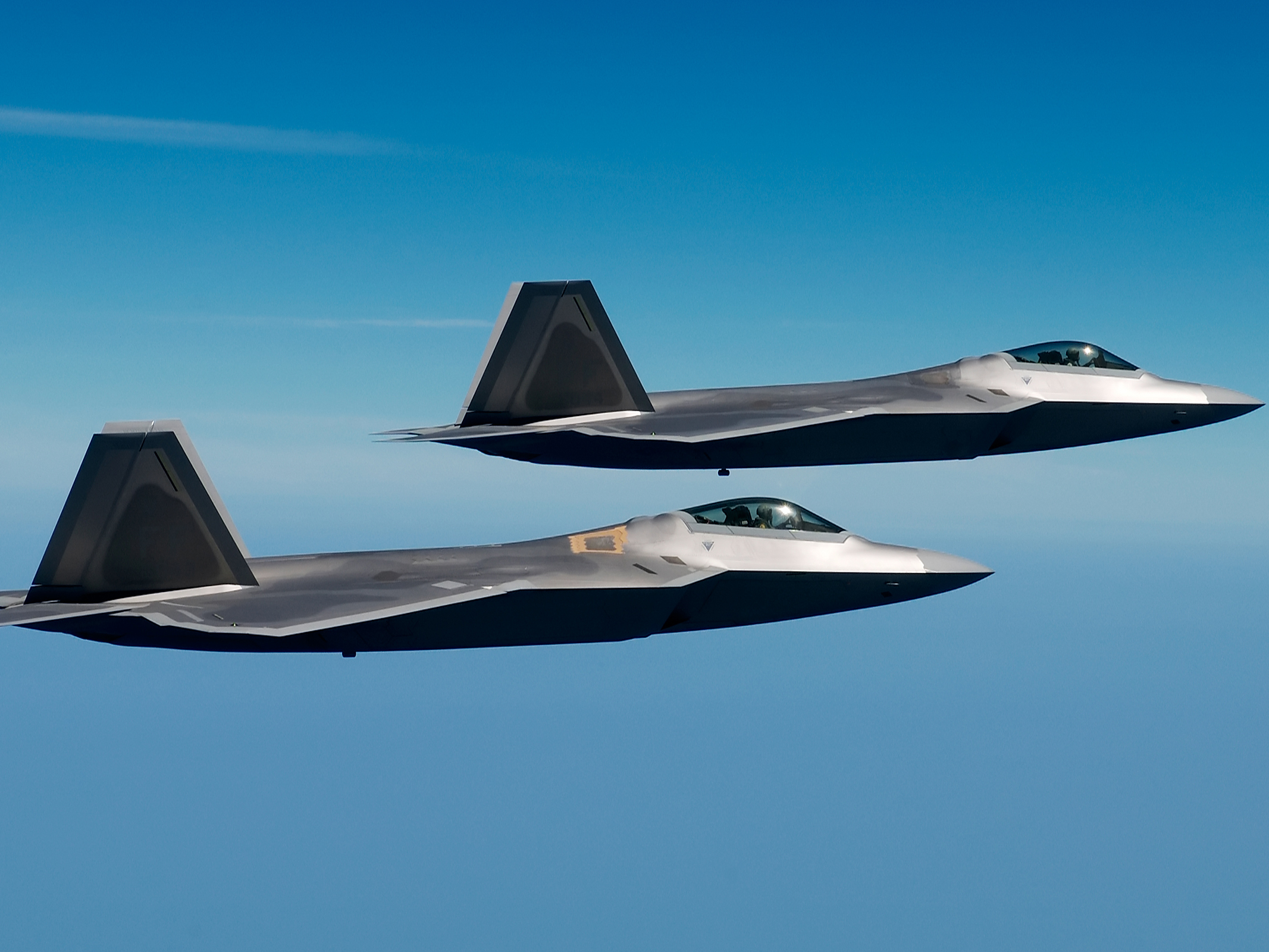 Description: Two jets flying in the sky with a blue sky background and a few clouds in the sky above them.