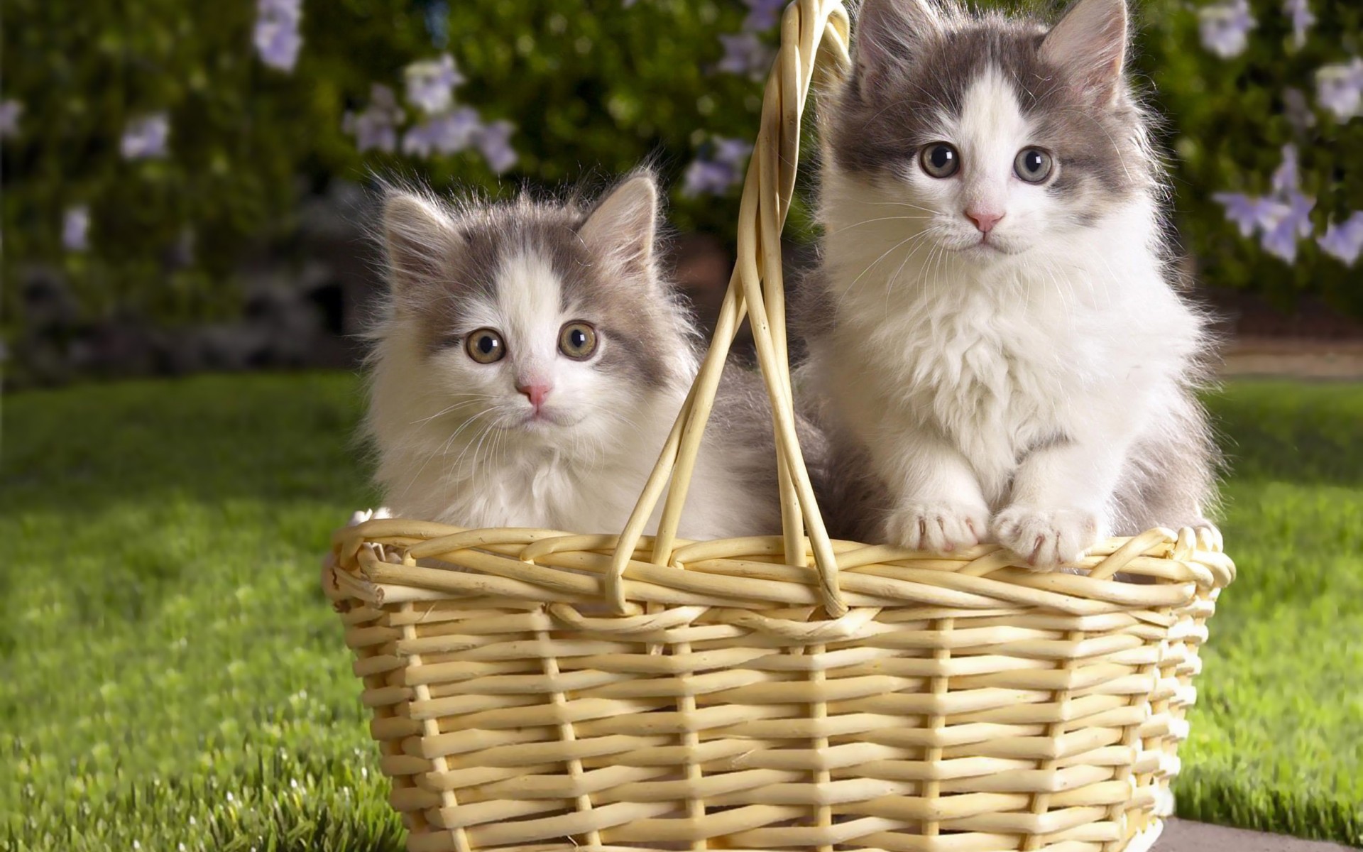 Description: Two kittens sitting in a basket on the grass outside in the sun.