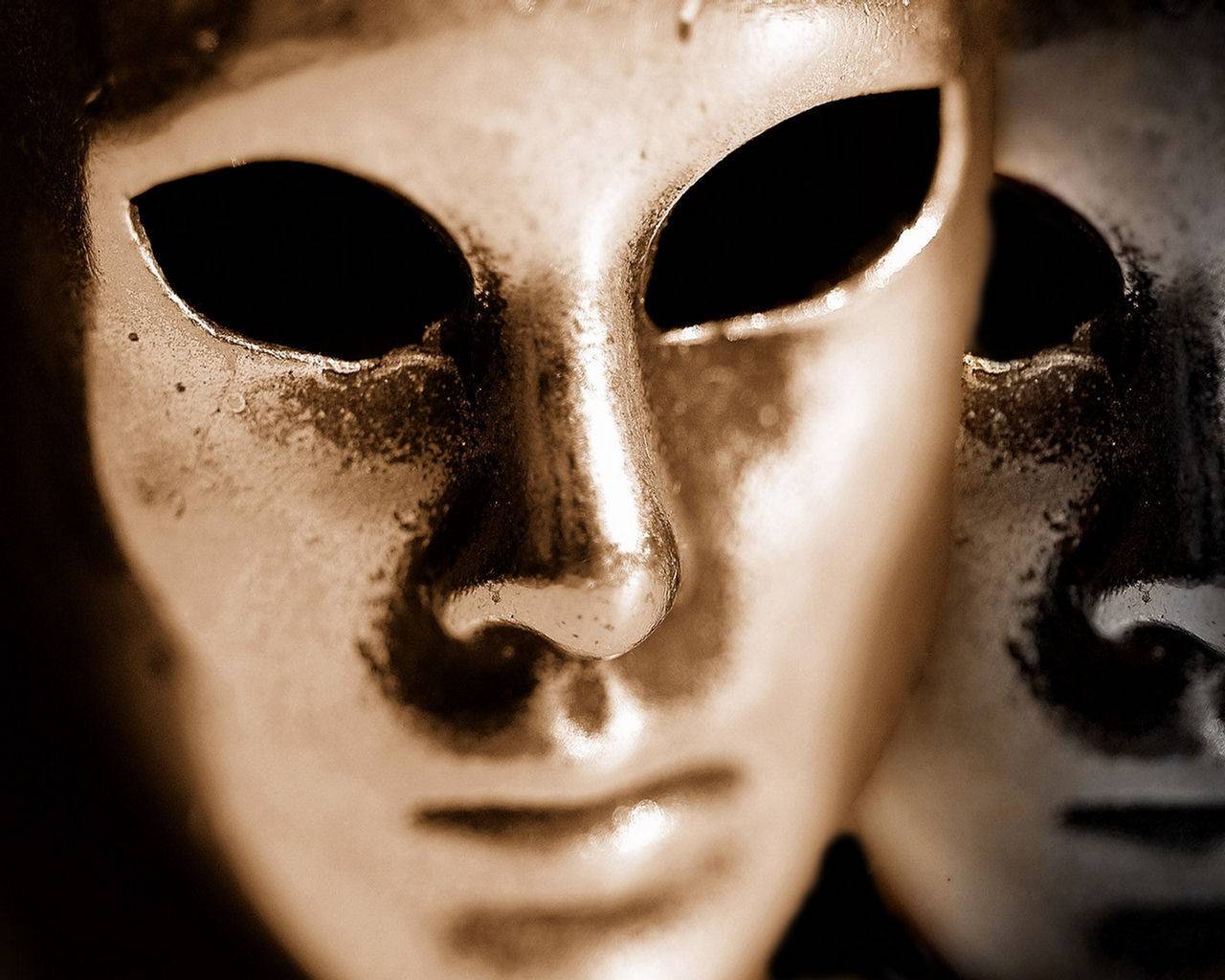 Description: Two masks with black and white faces are shown in sepia tone.