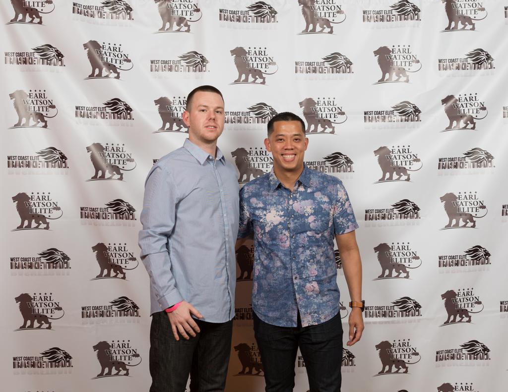 Description: Two men standing next to each other in front of a wall with a sign that says animal rescuers.