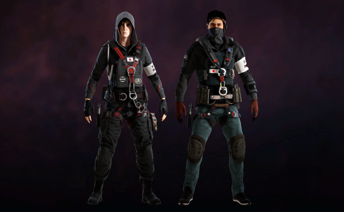 Description: Two men in full body gear standing in the dark with a hood on and a hood on their face.
