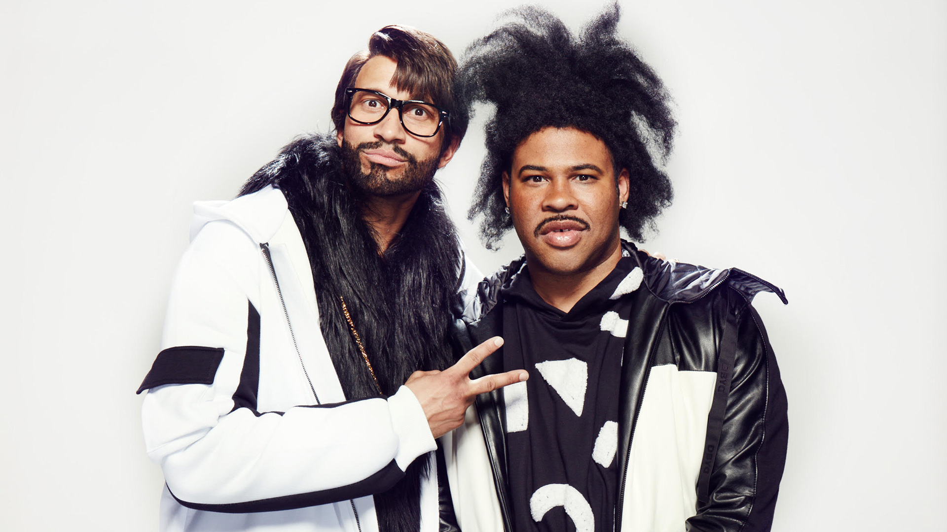 Description: Two men with long hair and glasses posing for a picture together.