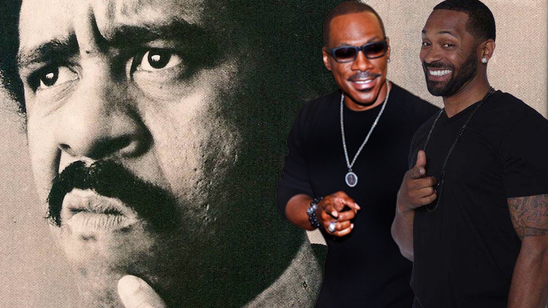 Description: Two men standing next to a large picture of a man with a mustache and a mustache on his face.
