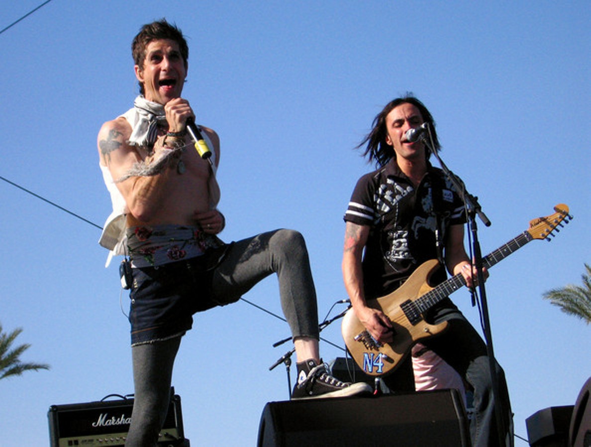 Description: Two men are playing guitars on stage with a microphone and a guitar in front of them and a microphone in the air.