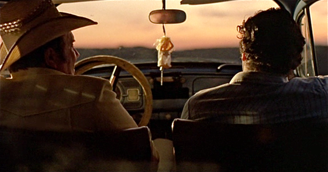 Description: Two men sitting in a car with a steering wheel and a steering stick in the back of the car.