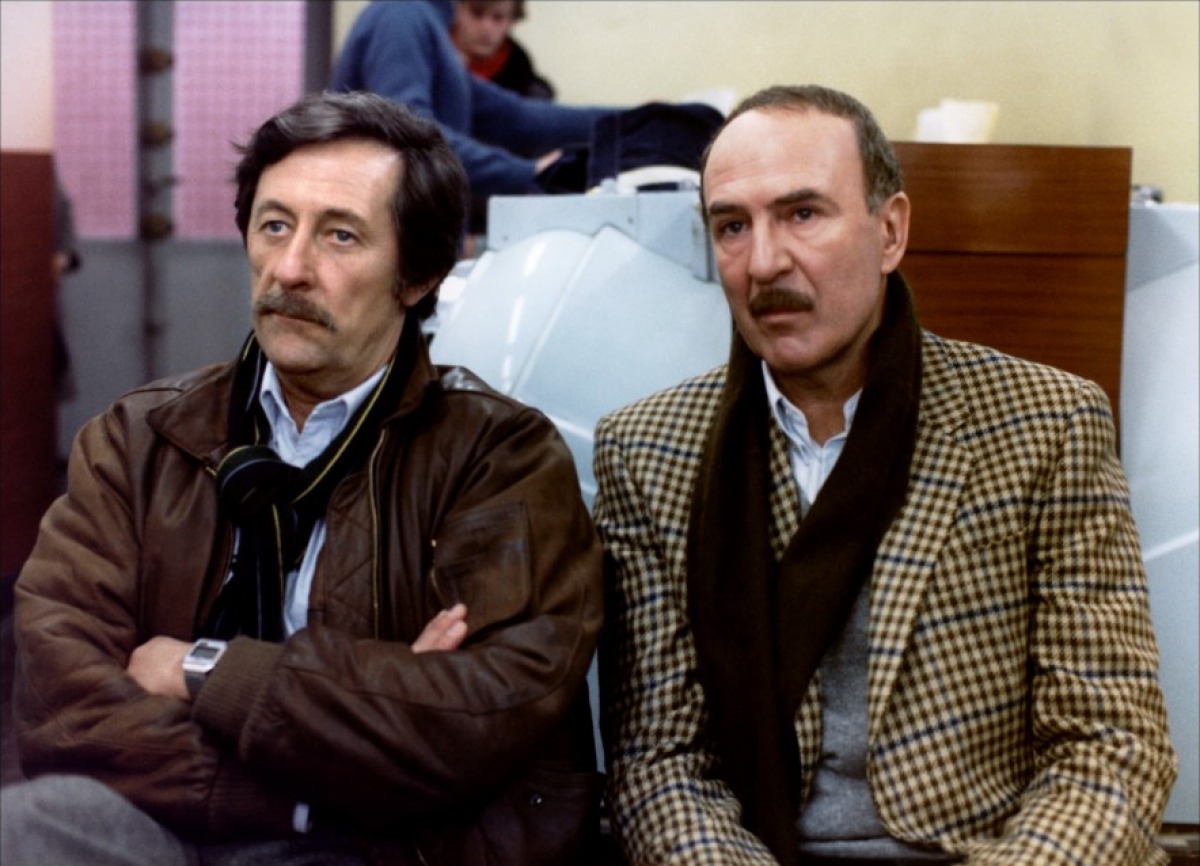 Description: Two men sitting next to each other in a room with a wall of cabinets and a chair in the background.