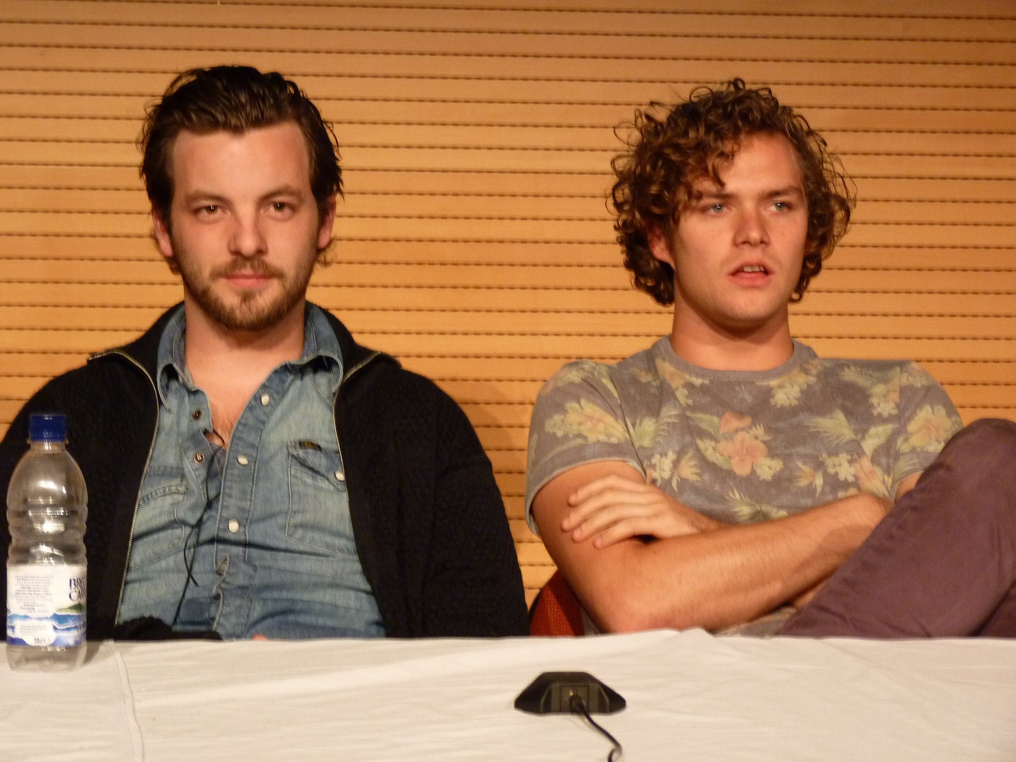 Description: Two men sitting next to each other at a table with a bottle of water on it and a microphone.