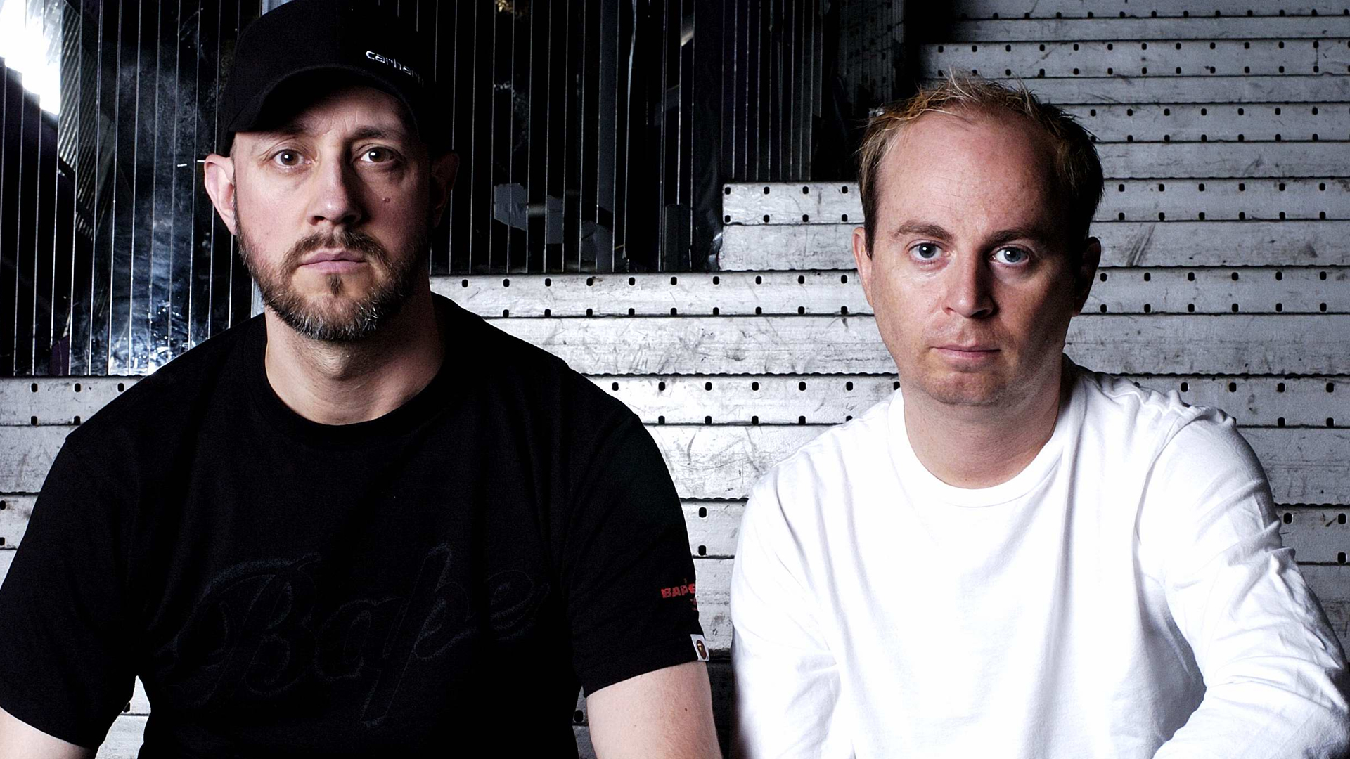 Description: Two men sitting next to each other in front of a wall with a clock on it's face.