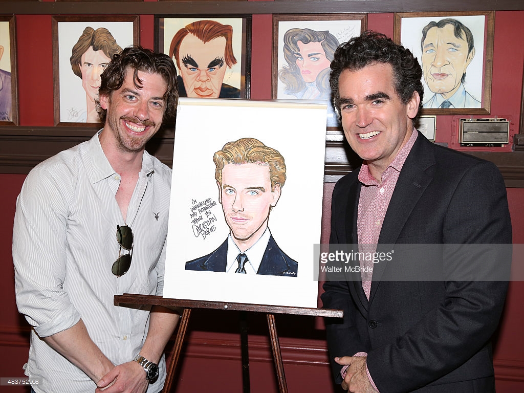 Description: Two men standing next to each other in front of a painting of a man with a mustache and a man with a mustache.