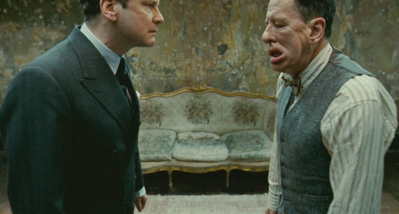 Description: Two men standing next to each other in a room with a couch and a chair in it and one man making a face.
