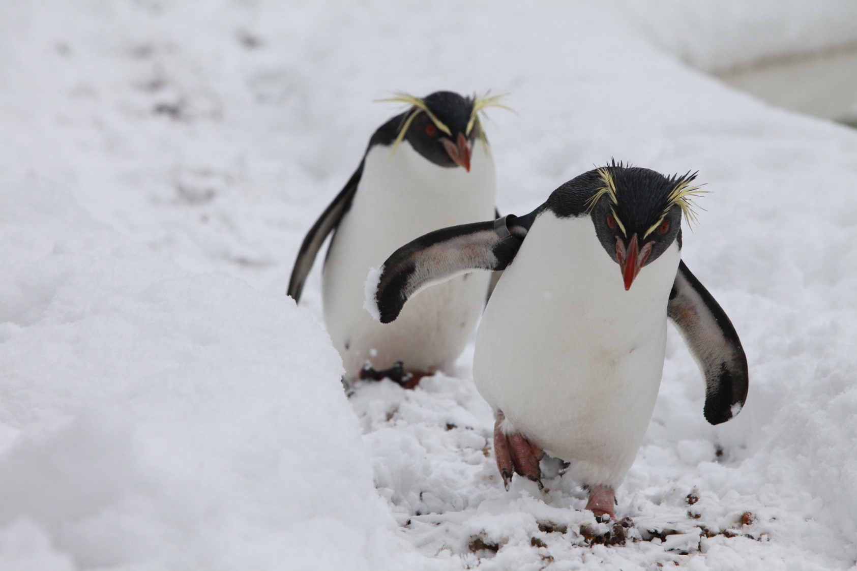 Description: Two penguins walking in the snow with their beaks open and eyes closed.