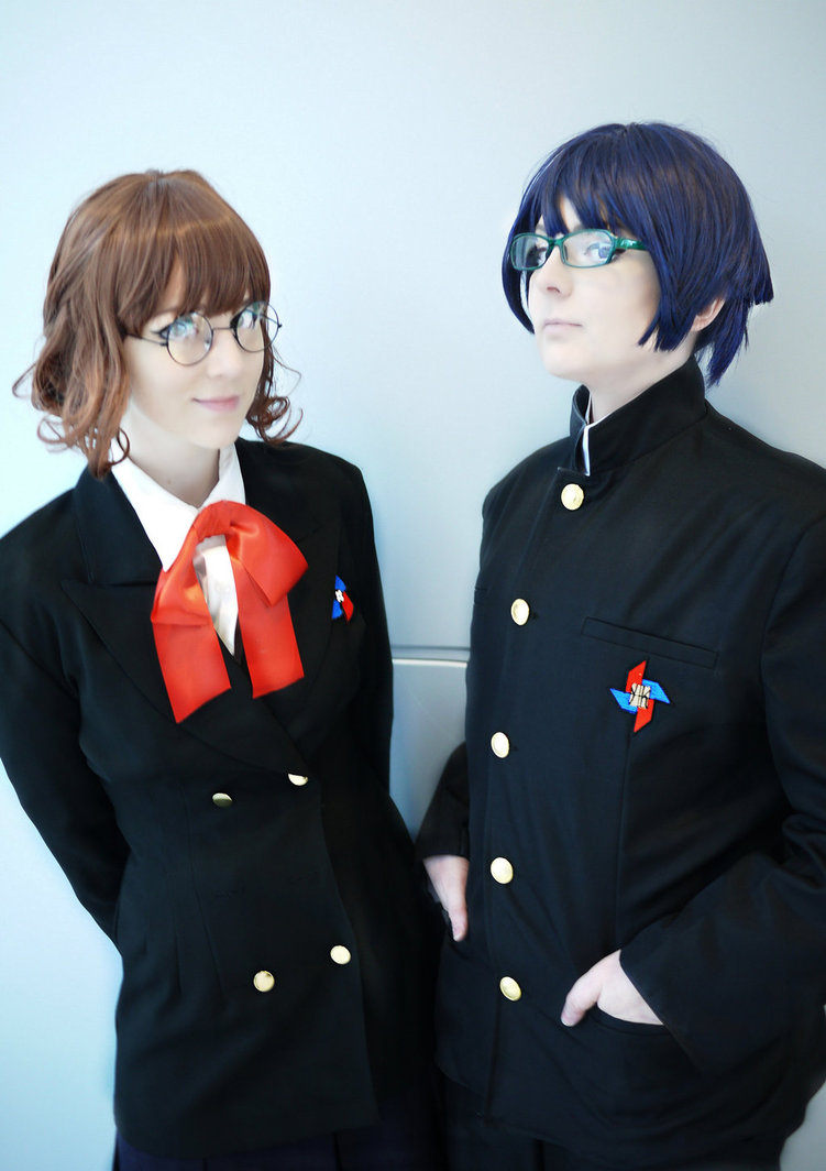 Description: Two people dressed in black and red standing next to each other in front of a wall with a red bow tie.