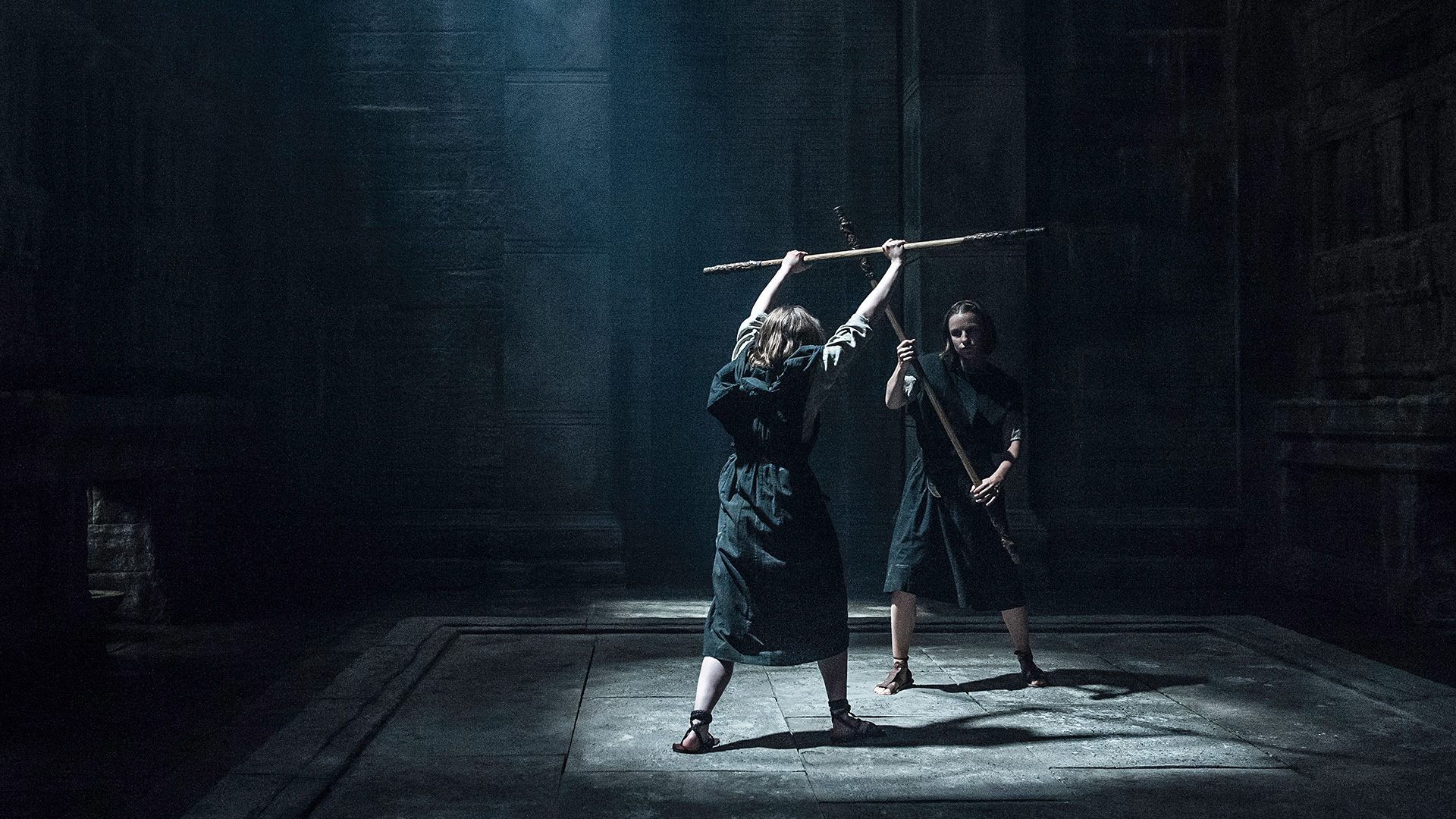 Description: Two people in a dark room holding sticks in their hands and standing on a stage with a light shining on them.