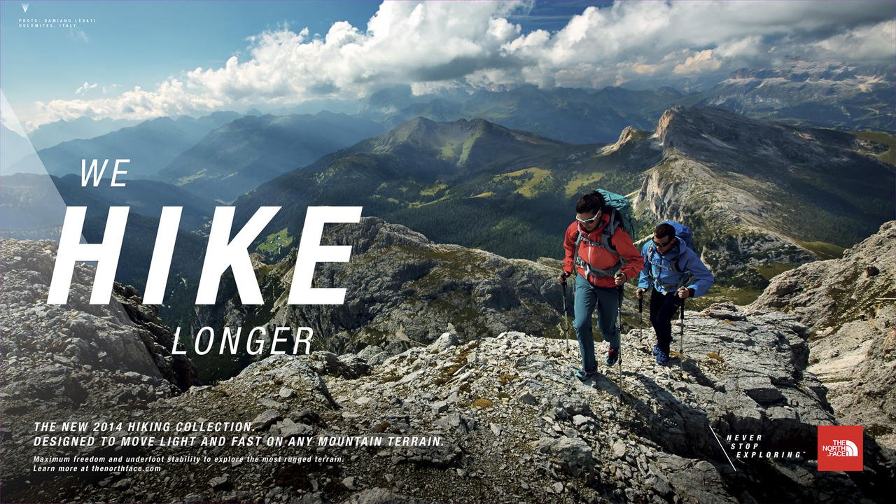 Description: Two people hiking up a mountain with the words we hike longer on it's side and the words we hike longer on the image.