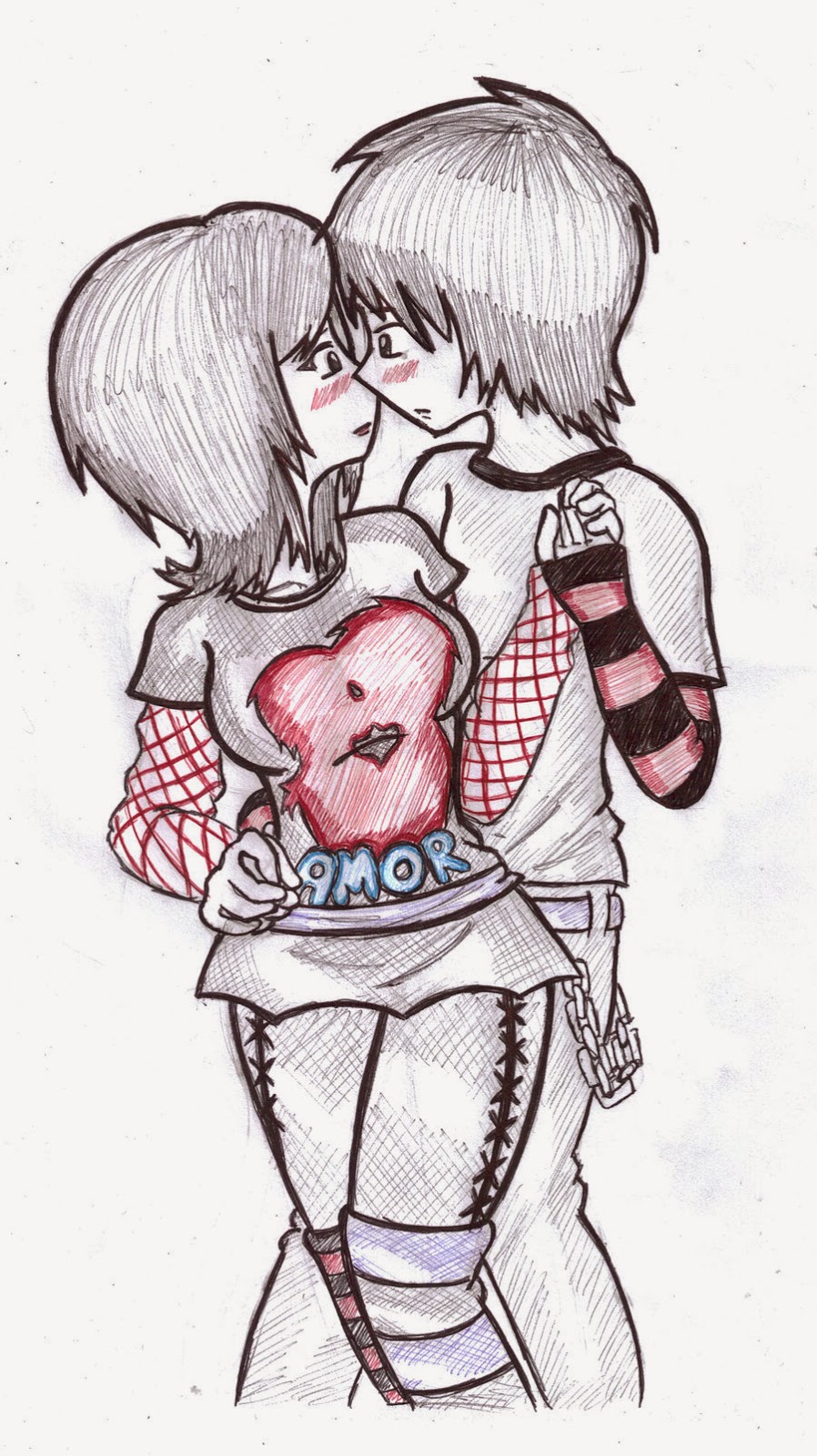 Description: A drawing of two people hugging each other with a teddy bear on the back of them.