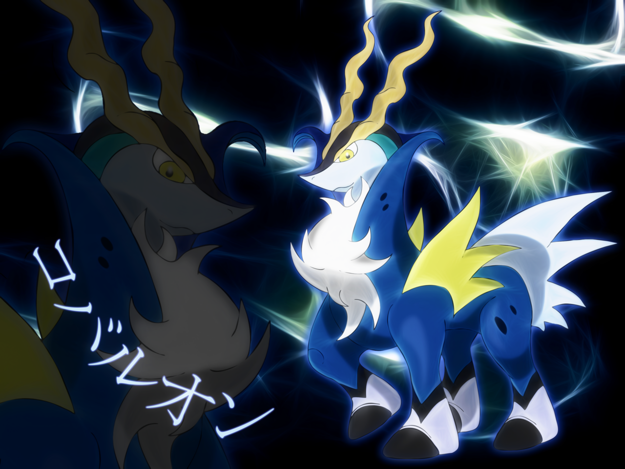 Description: Two pokemons are standing in the dark with their tails curled up and glowing in the dark.