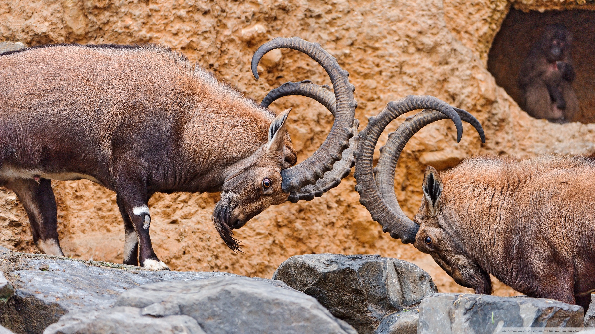 Description: Two rams fighting each other in a rocky area with rocks and a rock wall behind them.