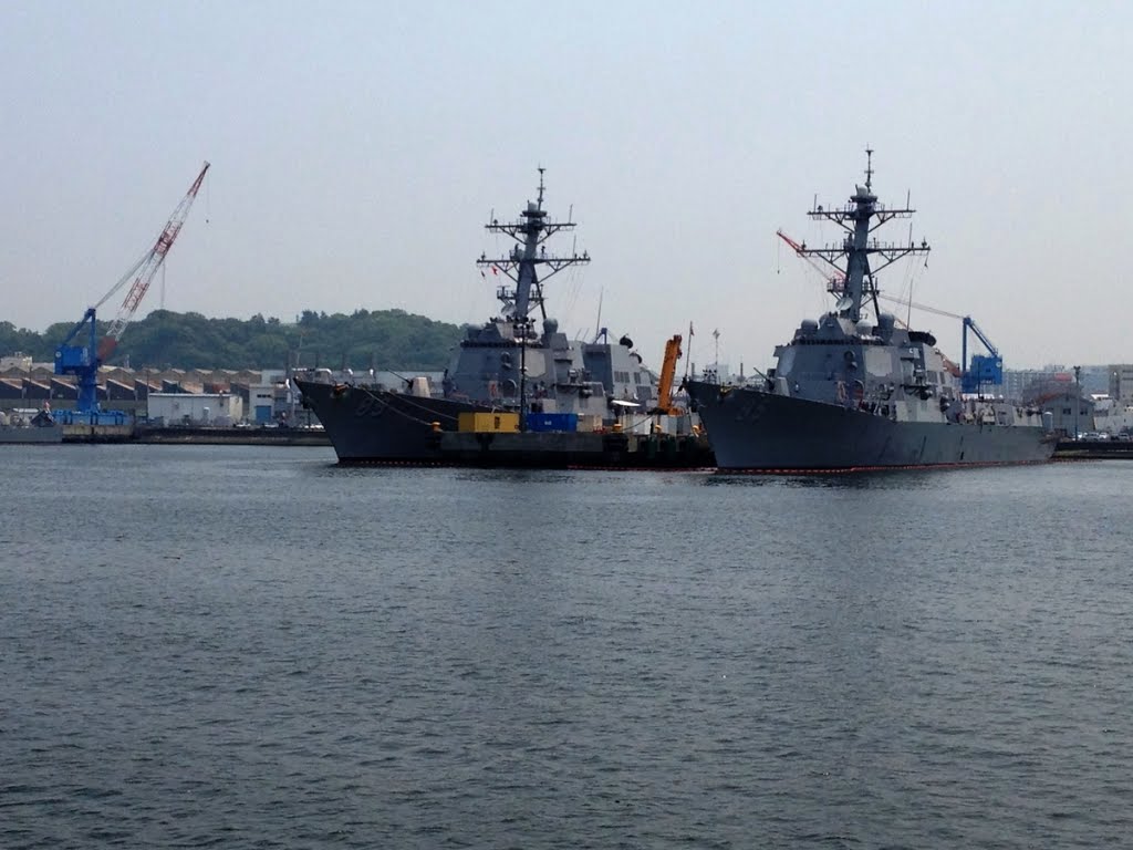 Description: Two ships are docked in the water near a dock and buildings in the background.