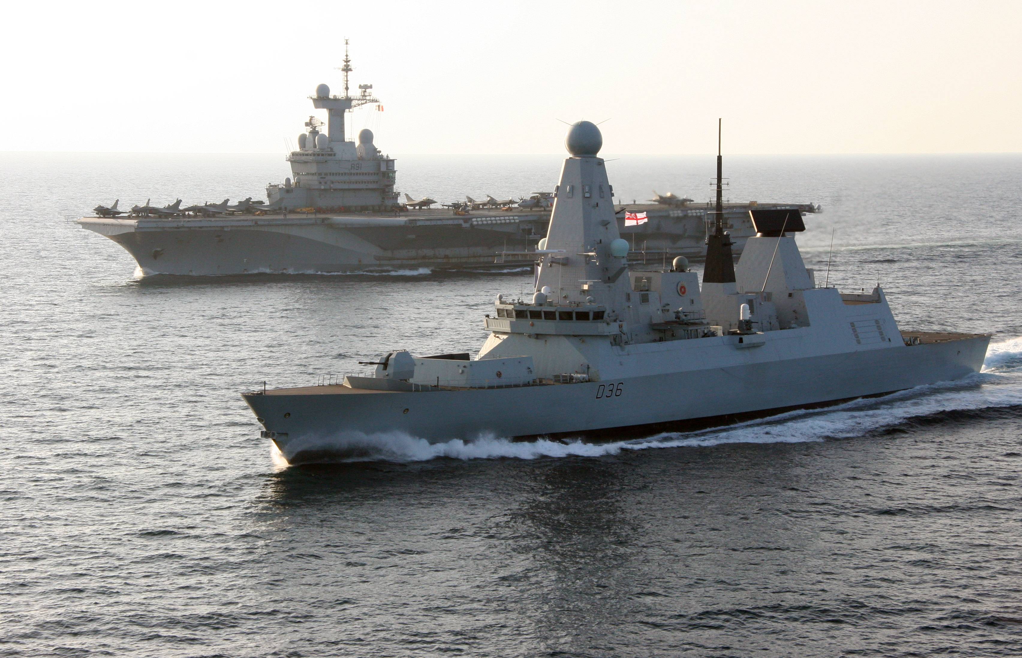 Description: Two ships in the water near each other in the ocean with one larger one in the background and one smaller one in the foreground.