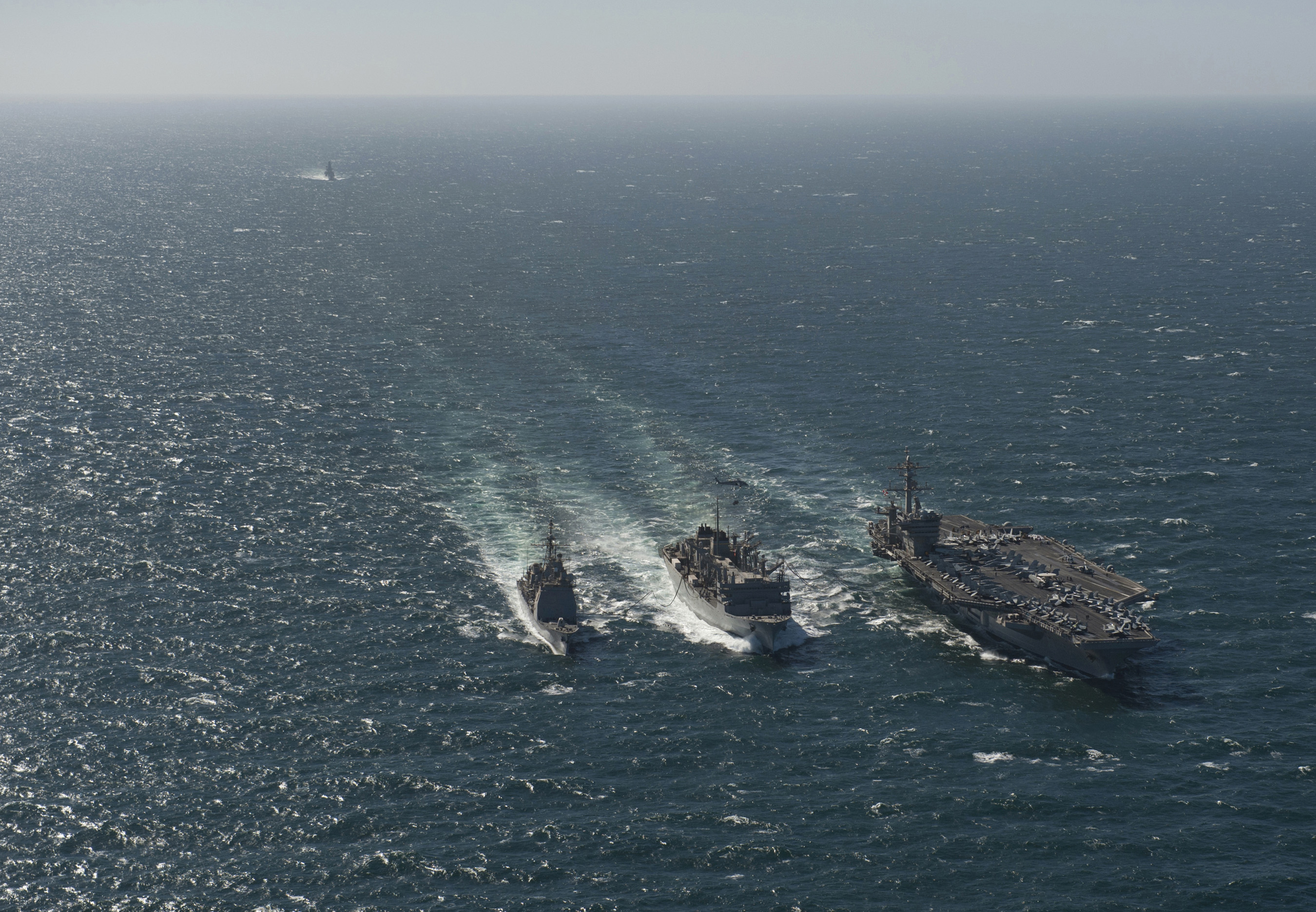 Description: Two ships in the ocean near each other with a boat in the background and a smaller boat in the middle of the water.