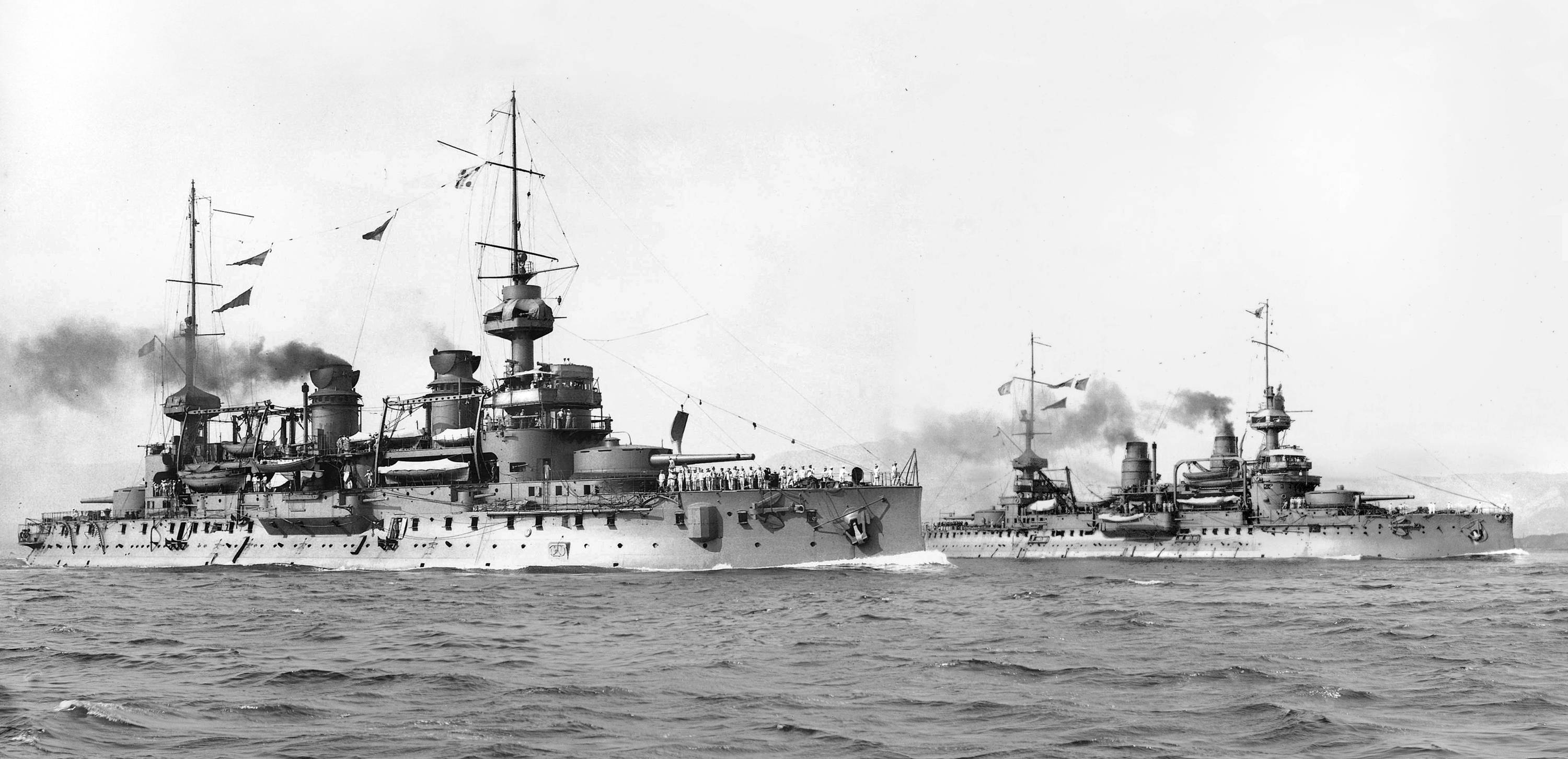 Description: Two ships in the water with smoke coming out of them and a few flags flying from them on the side of the ship.