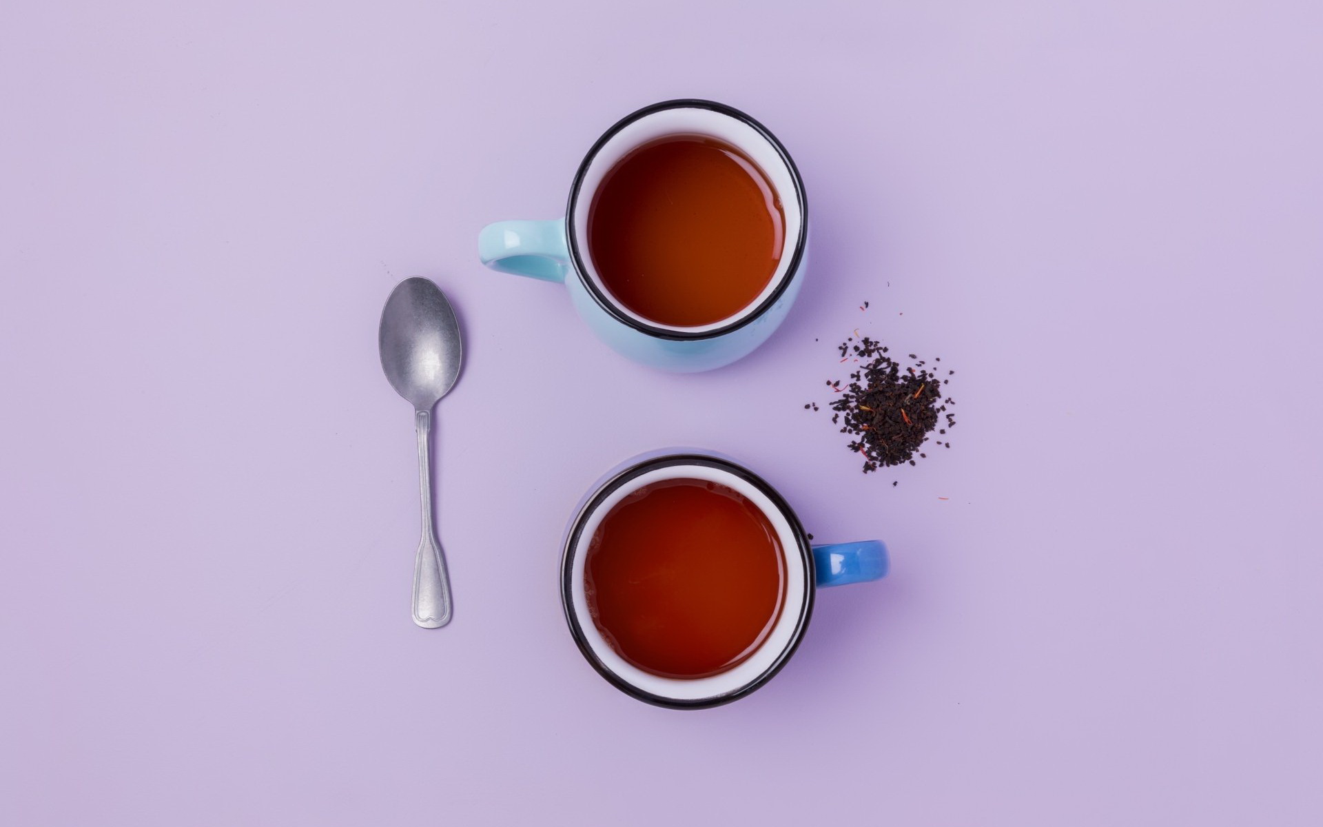 Description: Two cups of tea with spoons on a purple background with a spoon and a spoon rest on the side.