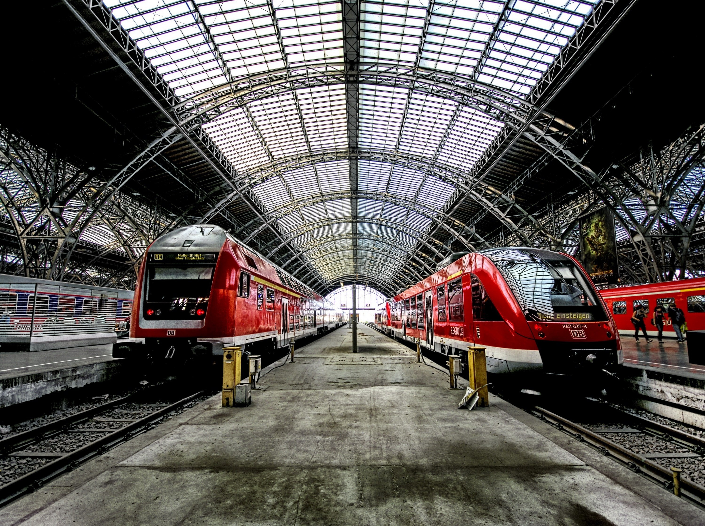 Description: Two trains are parked in a train station with a skylight overhead them and people standing on the platform.