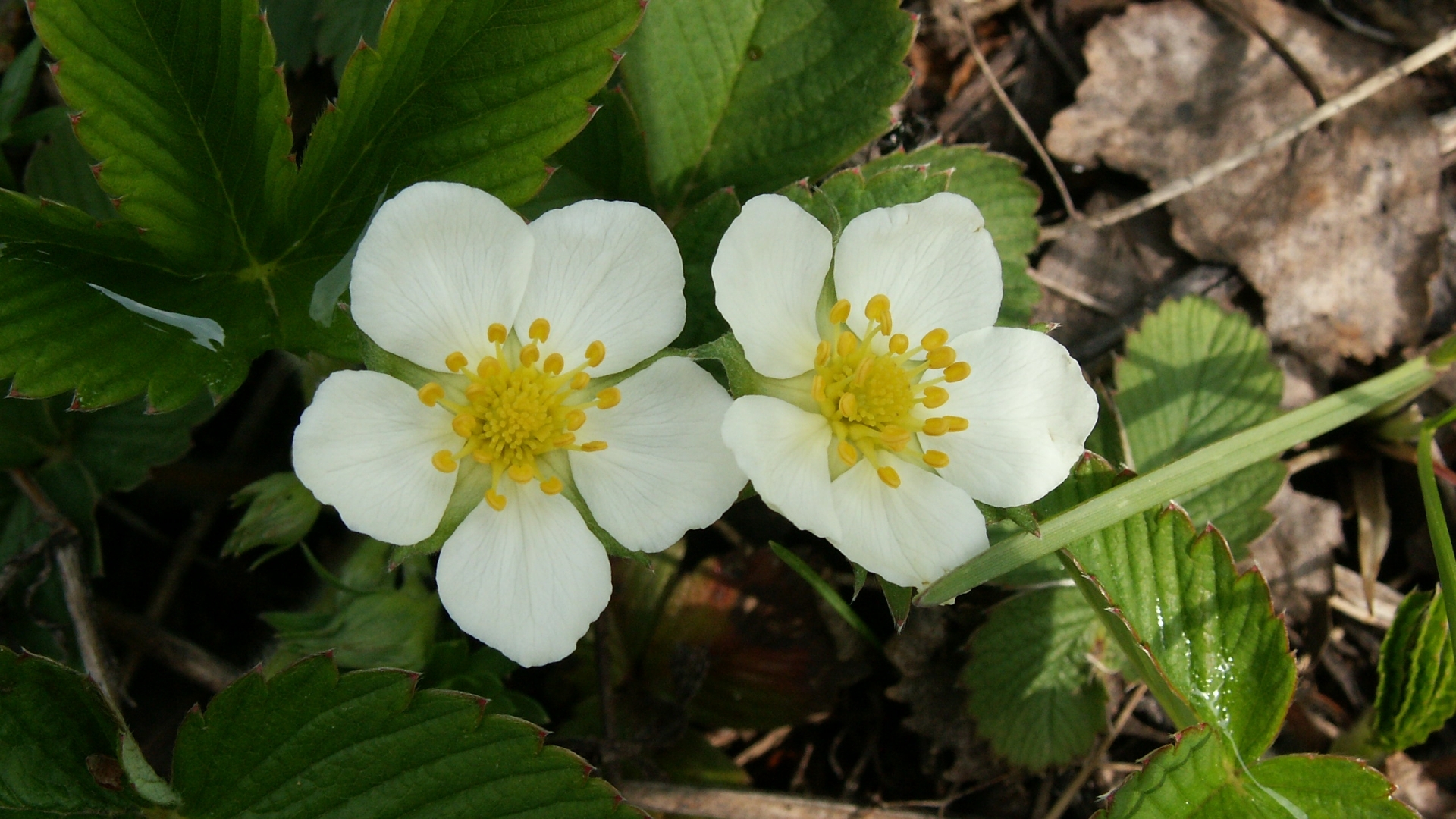 Description: Two white flowers with yellow centers on a green plant with leaves and dirt in the background.