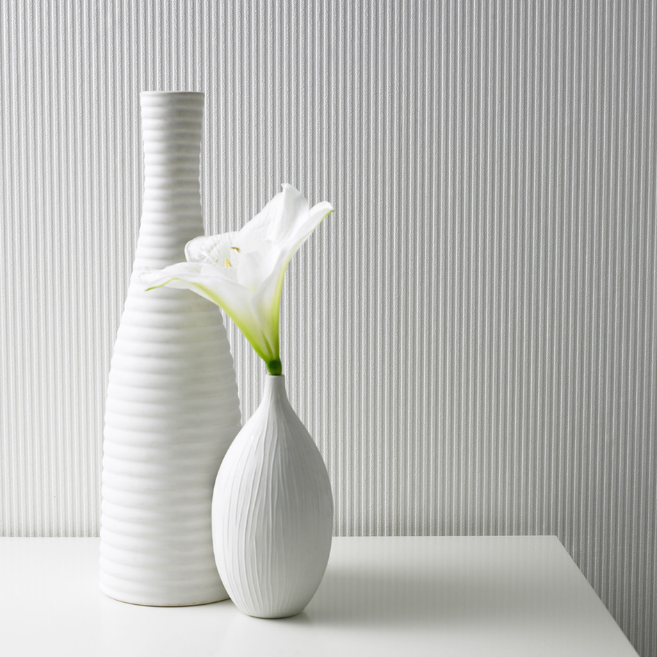 Description: Two white vases with a single flower in them on a table top with a wallpapered background.