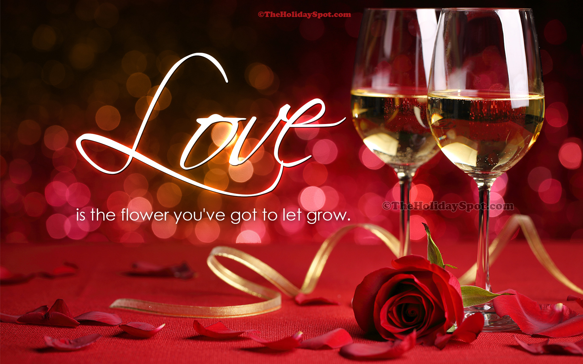 Description: Two glasses of wine with a rose on a table with a ribbon and a love message on it with a red background.