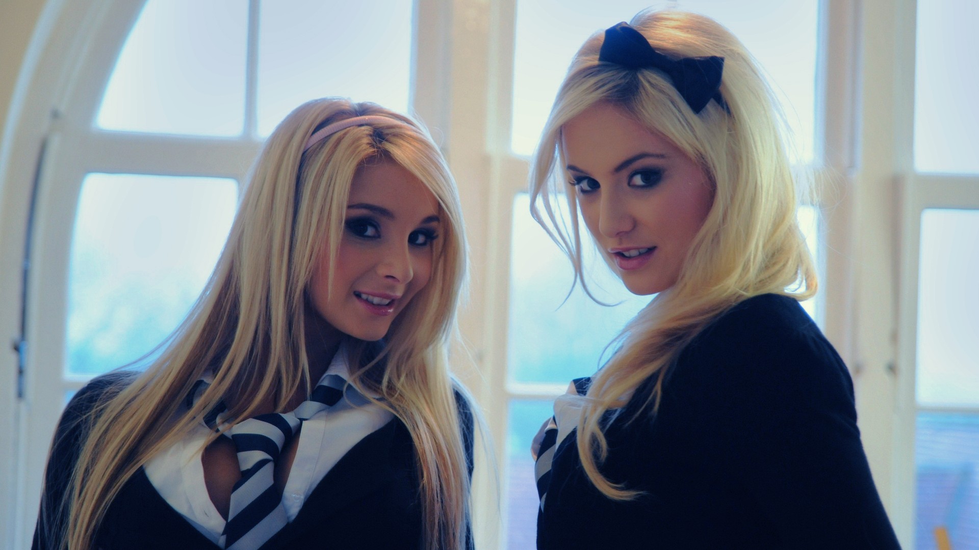 Description: Two women dressed in black and white posing for a picture together in front of a window with a large window pane.