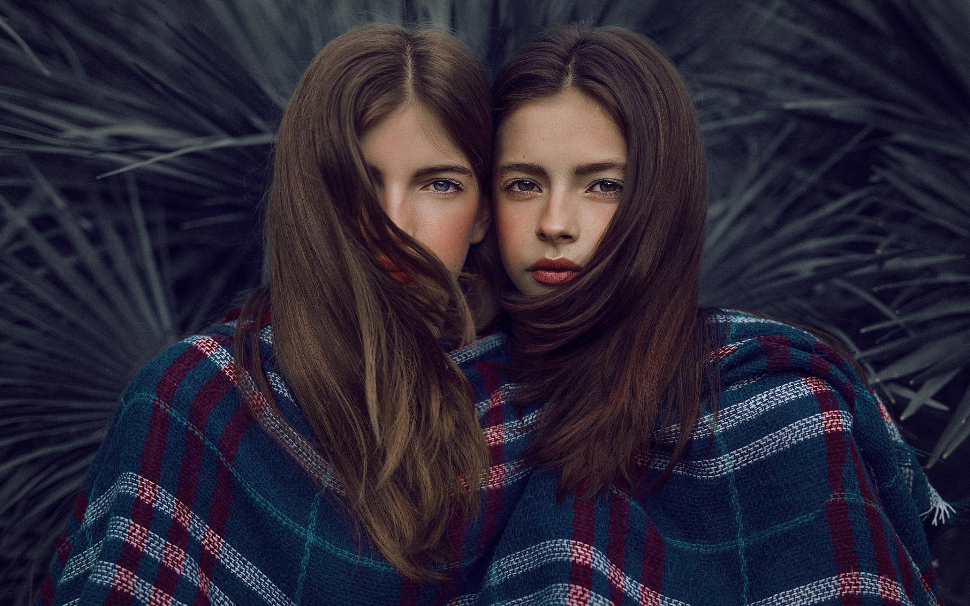 Description: Two women wrapped in a blanket are posing for a picture together in front of a palm tree with their heads tilted.