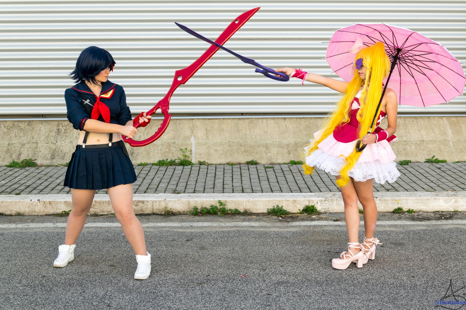 Description: Two women in costumes holding umbrellas on the street together.