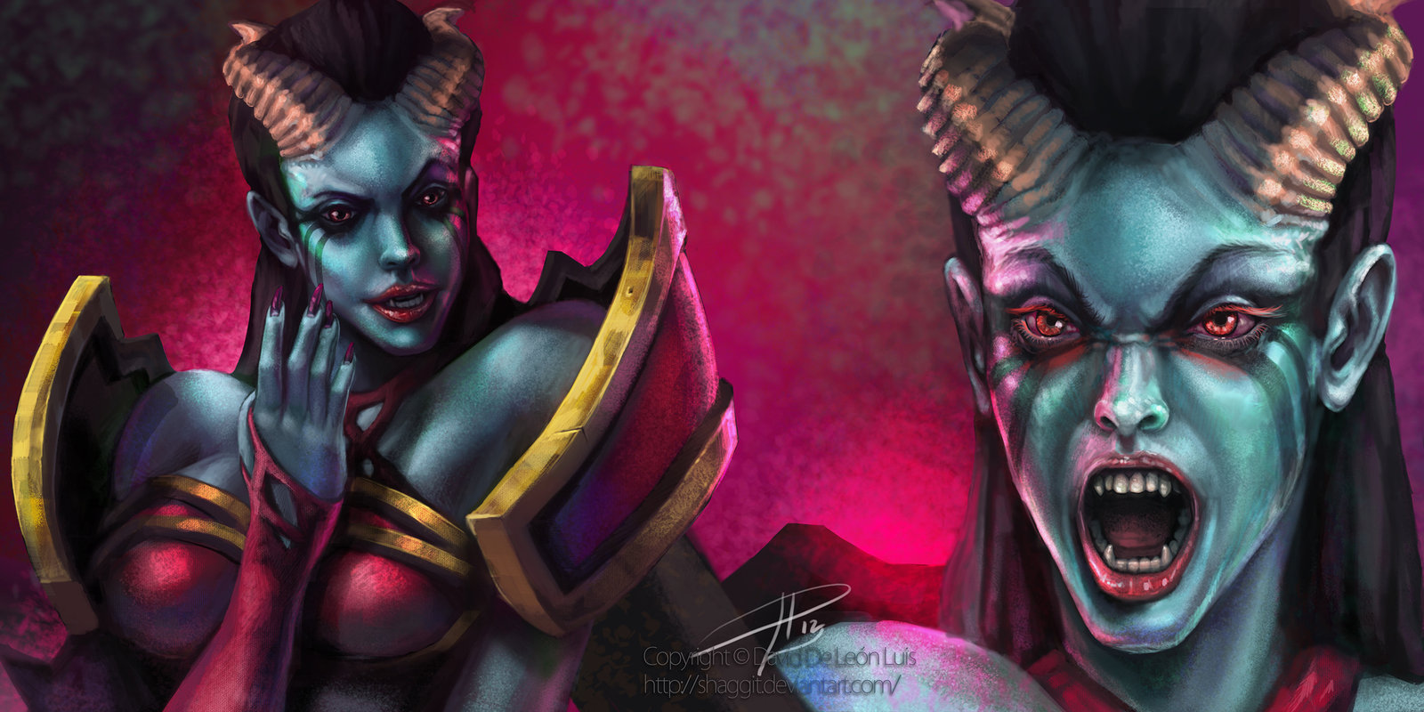 Description: Two women with horns and makeup are in a painting style.