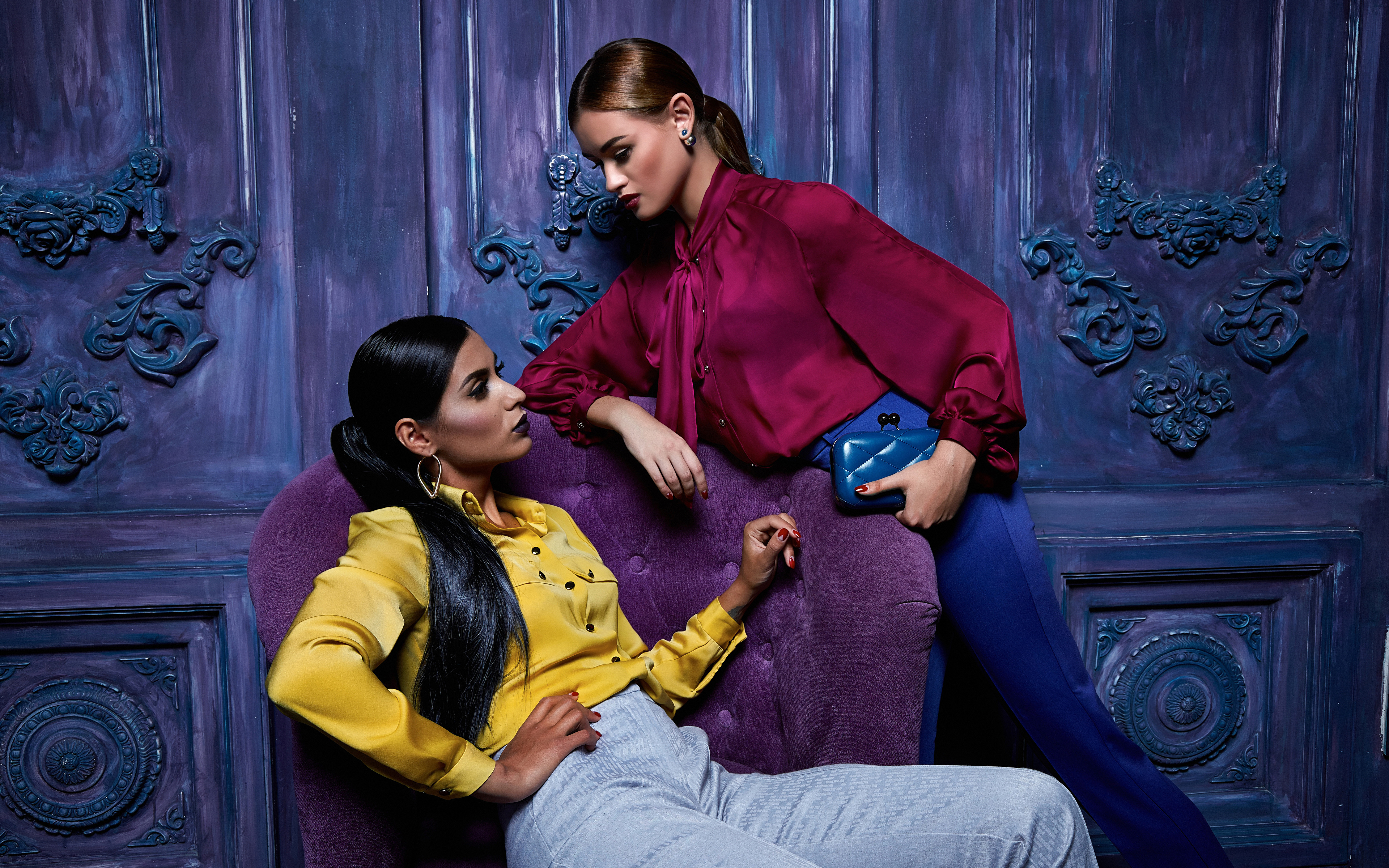 Description: Two women sitting on a purple chair with a blue purse in their hands and one of them is touching the other.