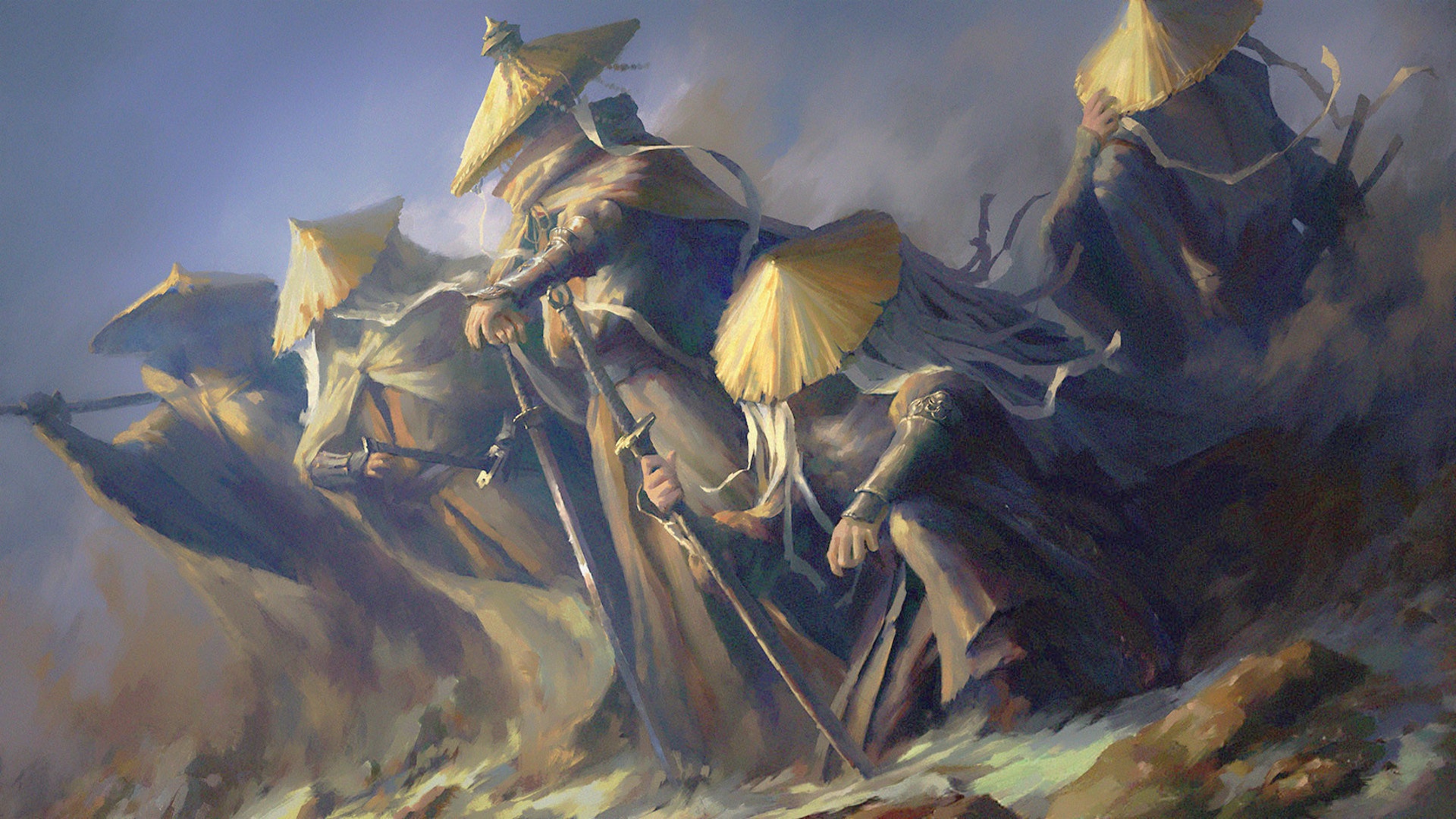 Description: A painting of a group of people with umbrellas on their heads and arms.