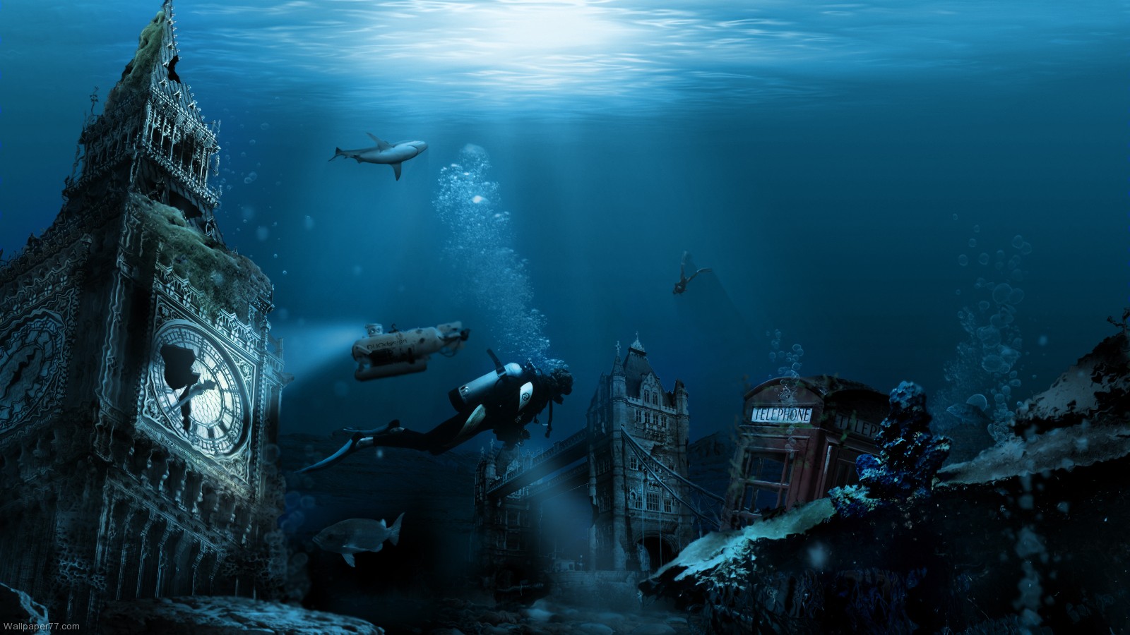 Description: A underwater scene of a clock tower and scuba divers in the water with a shark swimming by it and a shark swimming by.