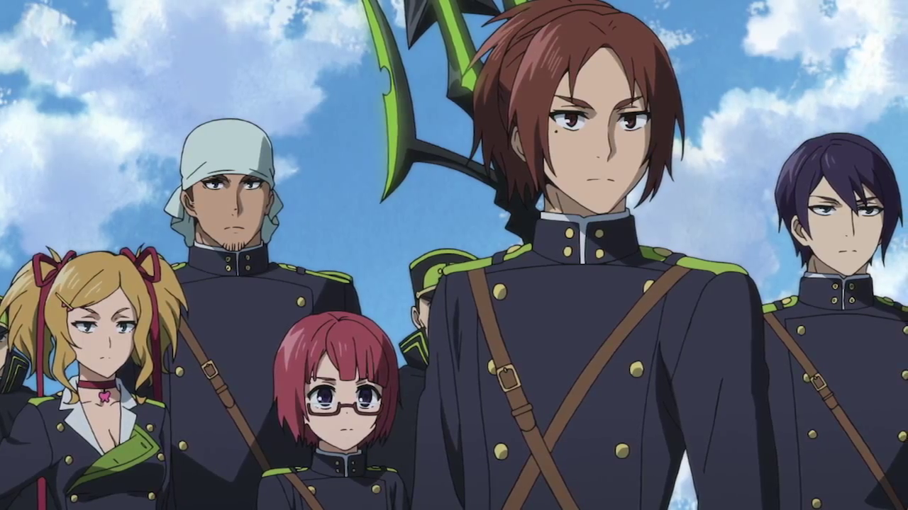 Description: A group of people in uniform standing next to each other in front of a blue sky with clouds and a green plant.