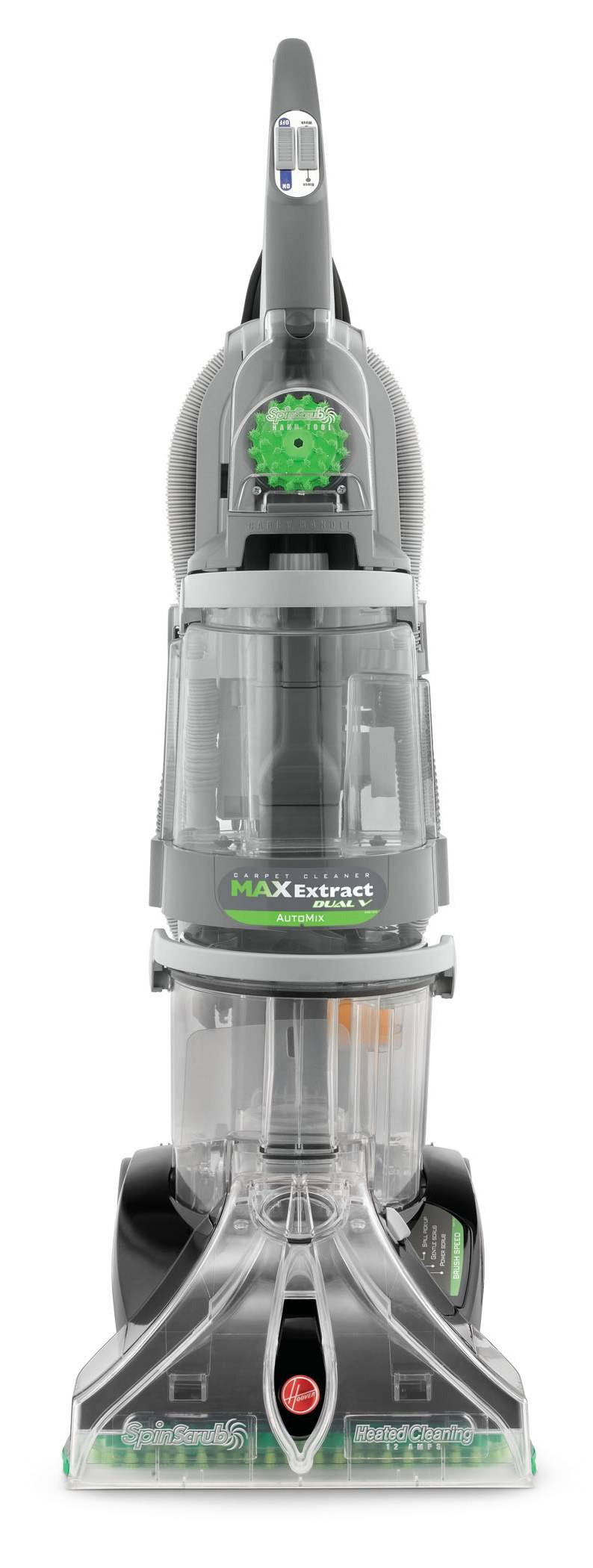 Description: A close up of a vacuum cleaner on a white background with a green light on the top of the vacuum.