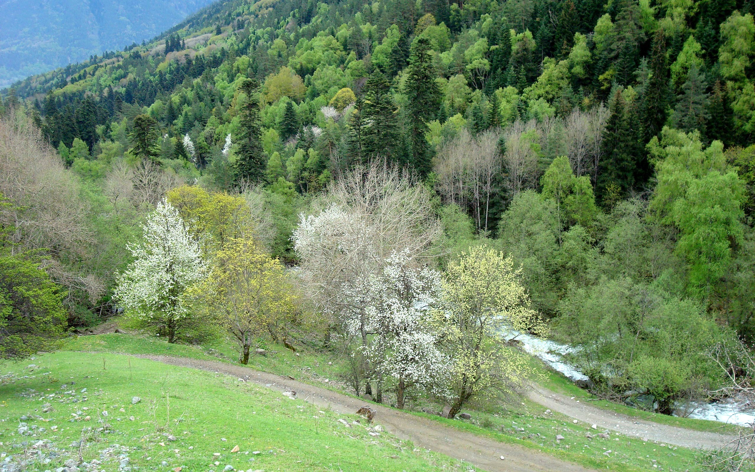 Description: A view of a valley with a dirt road and trees in the background and a stream running through the valley.