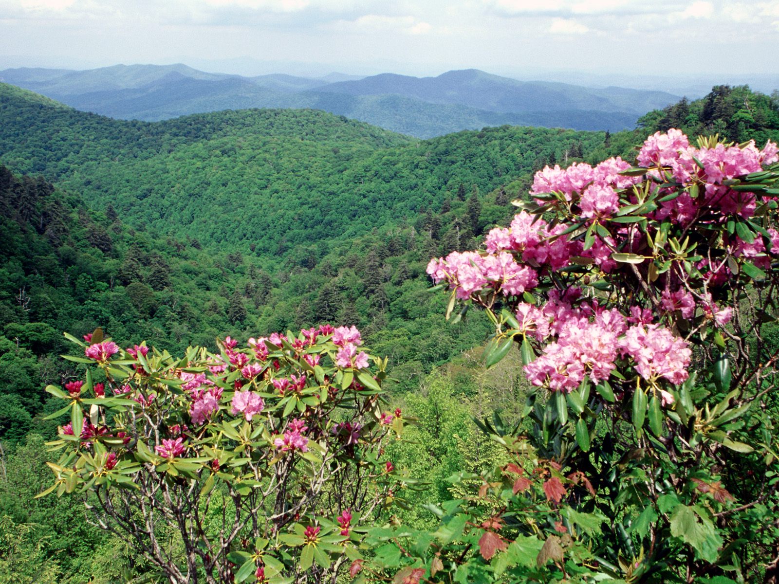 Description: A view of a valley with mountains in the background and flowers in the foreground.
