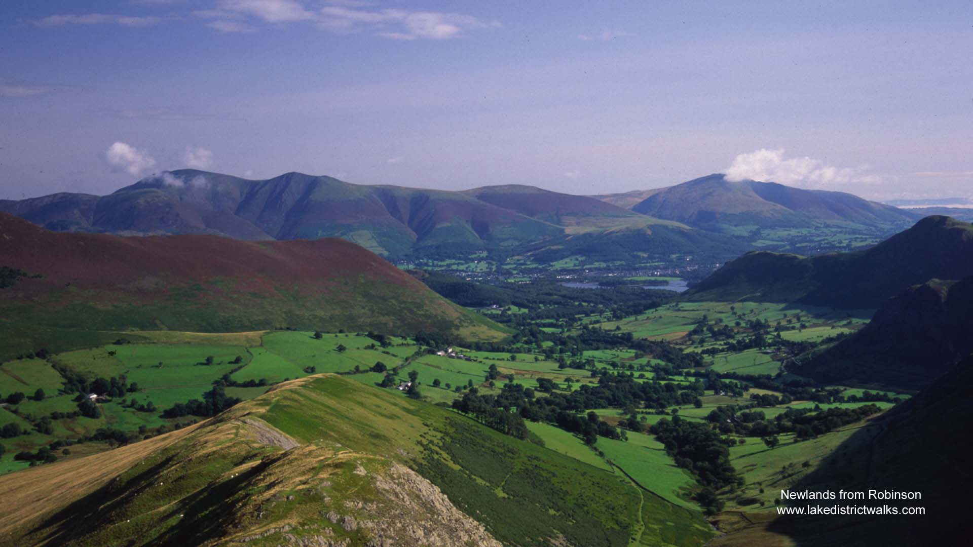 Description: A view of a valley with mountains in the background and a lake in the foreground with a few clouds in the sky.
