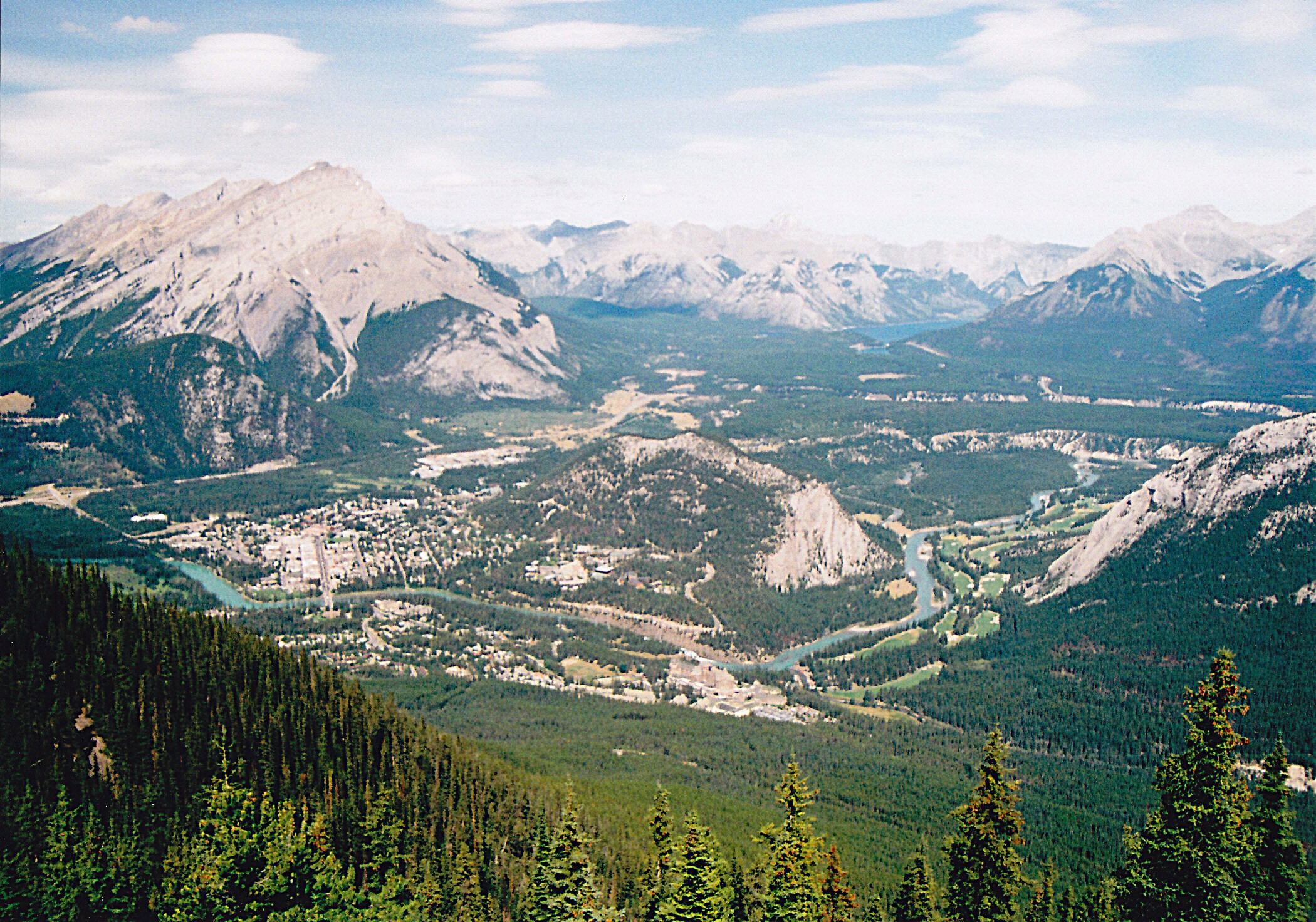 Description: A view of a valley and mountains from a high point of view of a town and a river running through it.