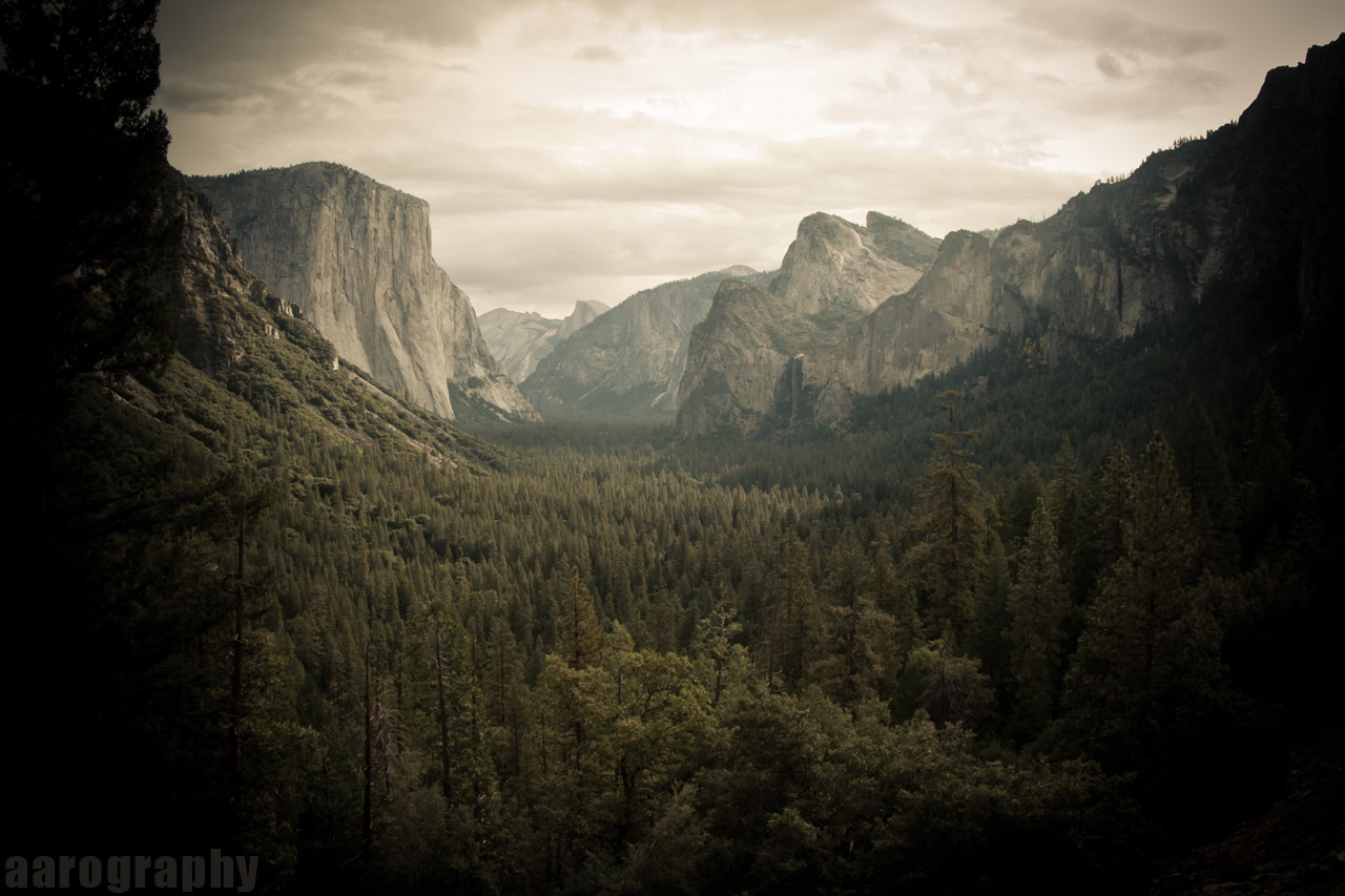 Description: A view of a valley with mountains in the background and trees in the foreground.